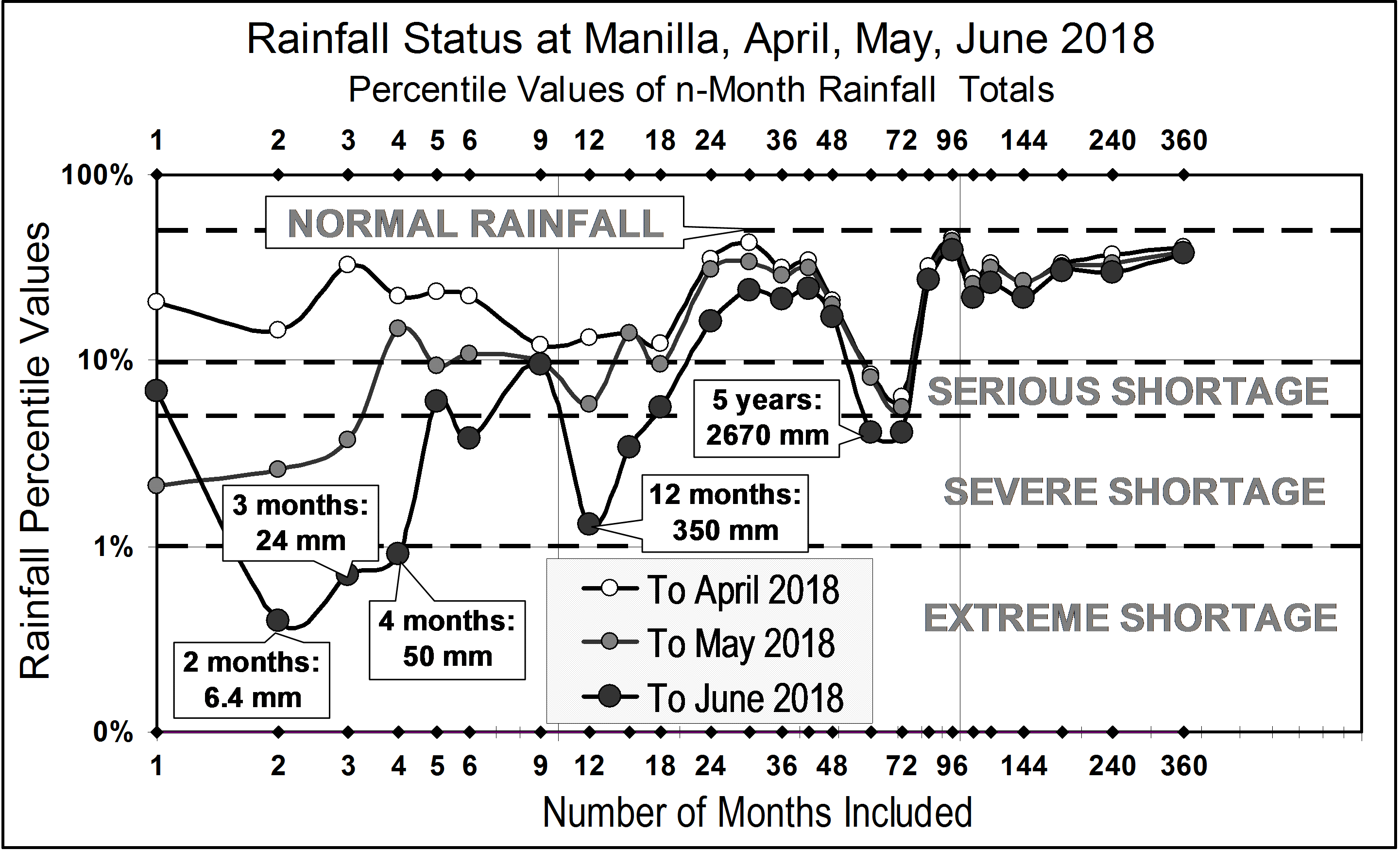 Published July 6, 2018 at 2882 × 1751 in Rainfall Shortages up to June 2018 « Previous Graph showing shortages of rainfall at Manilla NSW at April, May, and June 2018. Percentile values of periods of one month up to 360 months are shown as percentiles, classed as extreme, severe, or serious.