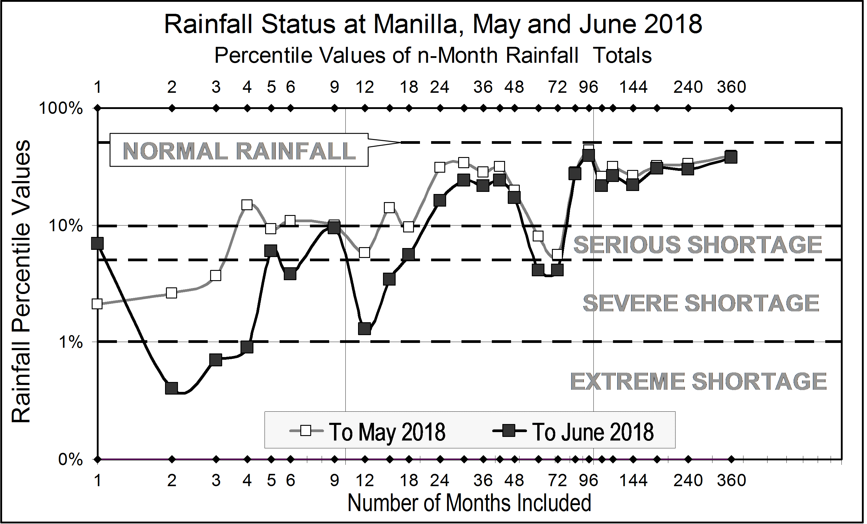 Published June 30, 2018 at 2884 × 1745 in Rainfall Shortages up to June 2018 Next » Graph showing shortages of rainfall at Manilla NSW at June 2018. Percentile values of periods of one month up to 360 months are shown as percentiles, classed as extreme, severe, or serious.