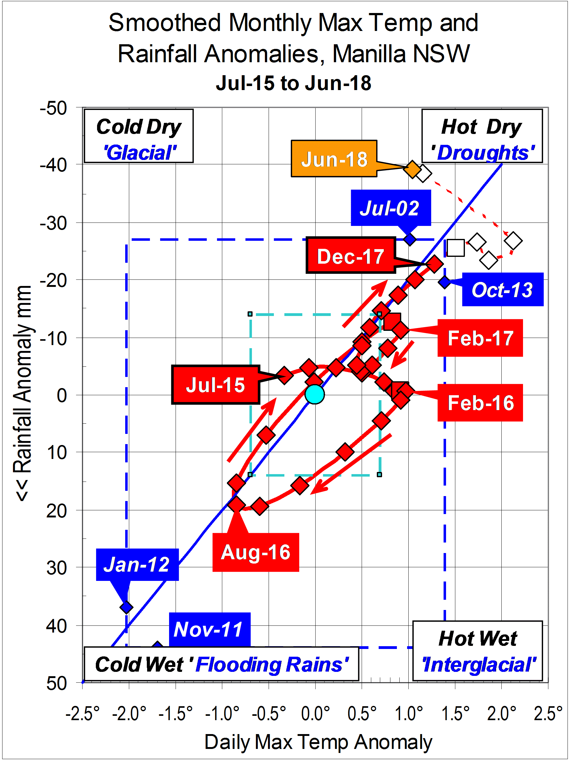 Published July 1, 2018 at 1844 × 2459 in Cycling into drought A parametric plot relating smoothed monthly rainfall anomaly versus smoothed daily maximum temperature anomaly for three years ending June 2018 at Manilla NSW.