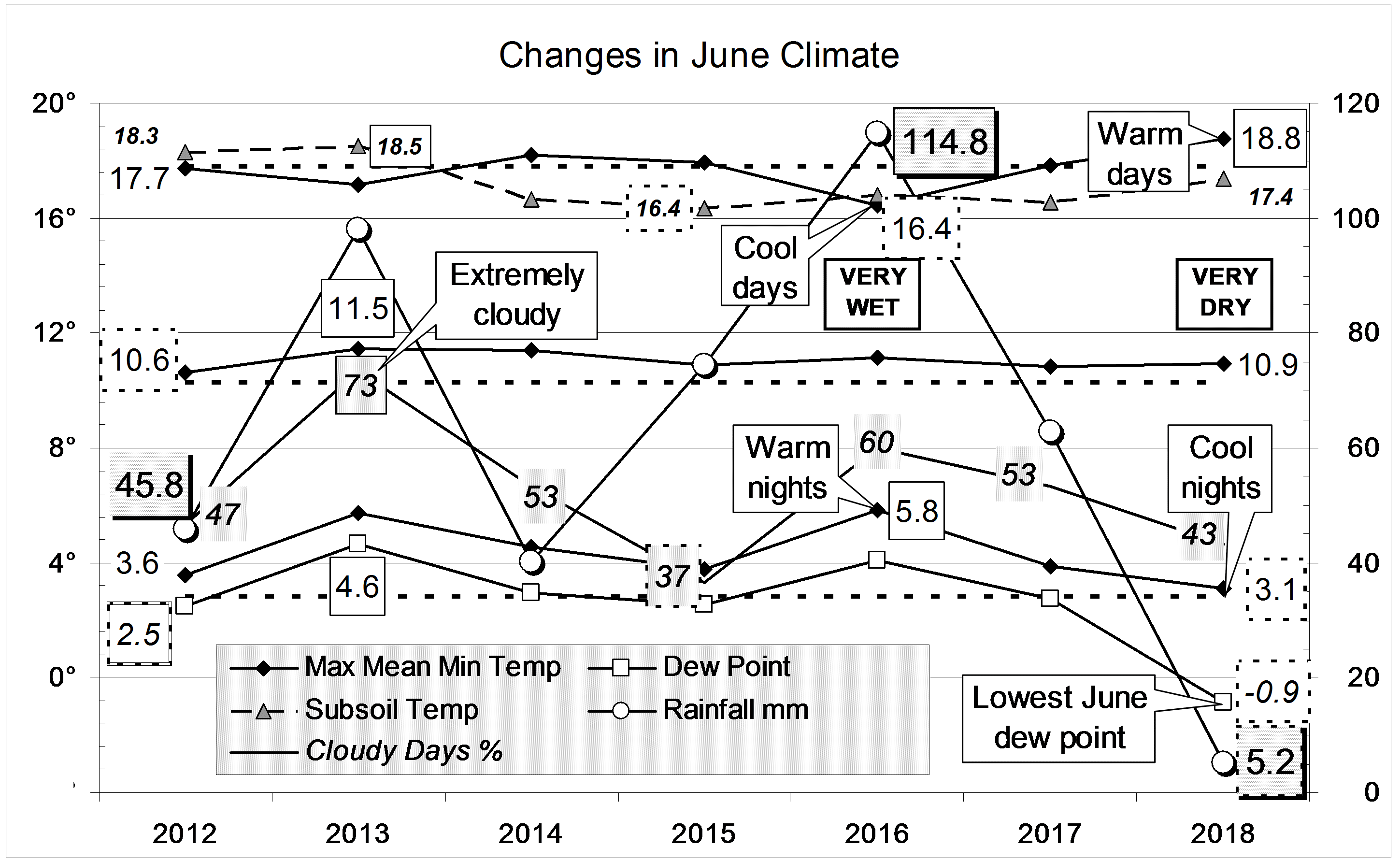 Published July 4, 2018 at 2898 × 1782 in June 2018 in drought « Previous Graphical log of the last seven June months at Manilla, NSW, showing mean values of maximum, minimum and mean temperature, soil temperature, early morning dew point and cloudy days percent, and total monthly rainfall in millimetres.