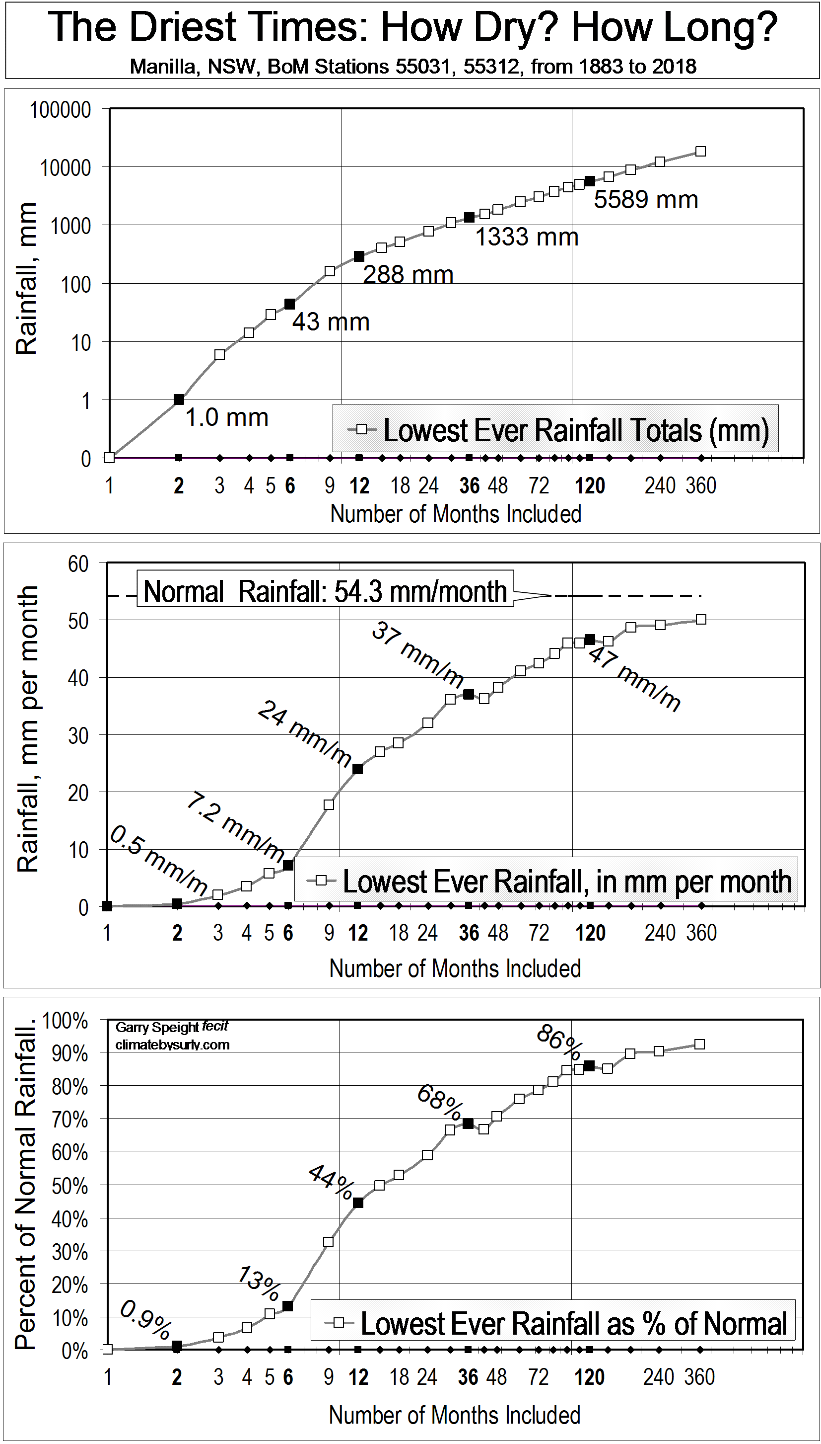 Published July 15, 2018 at 1654 × 2906 in Short Droughts are Worst Next » Lowest ever rainfall values for periods from one month to 360 months, from the 134-year record at Manilla, NSW, Australia. Graphs show totals, rainfall rates, and percentage rates.