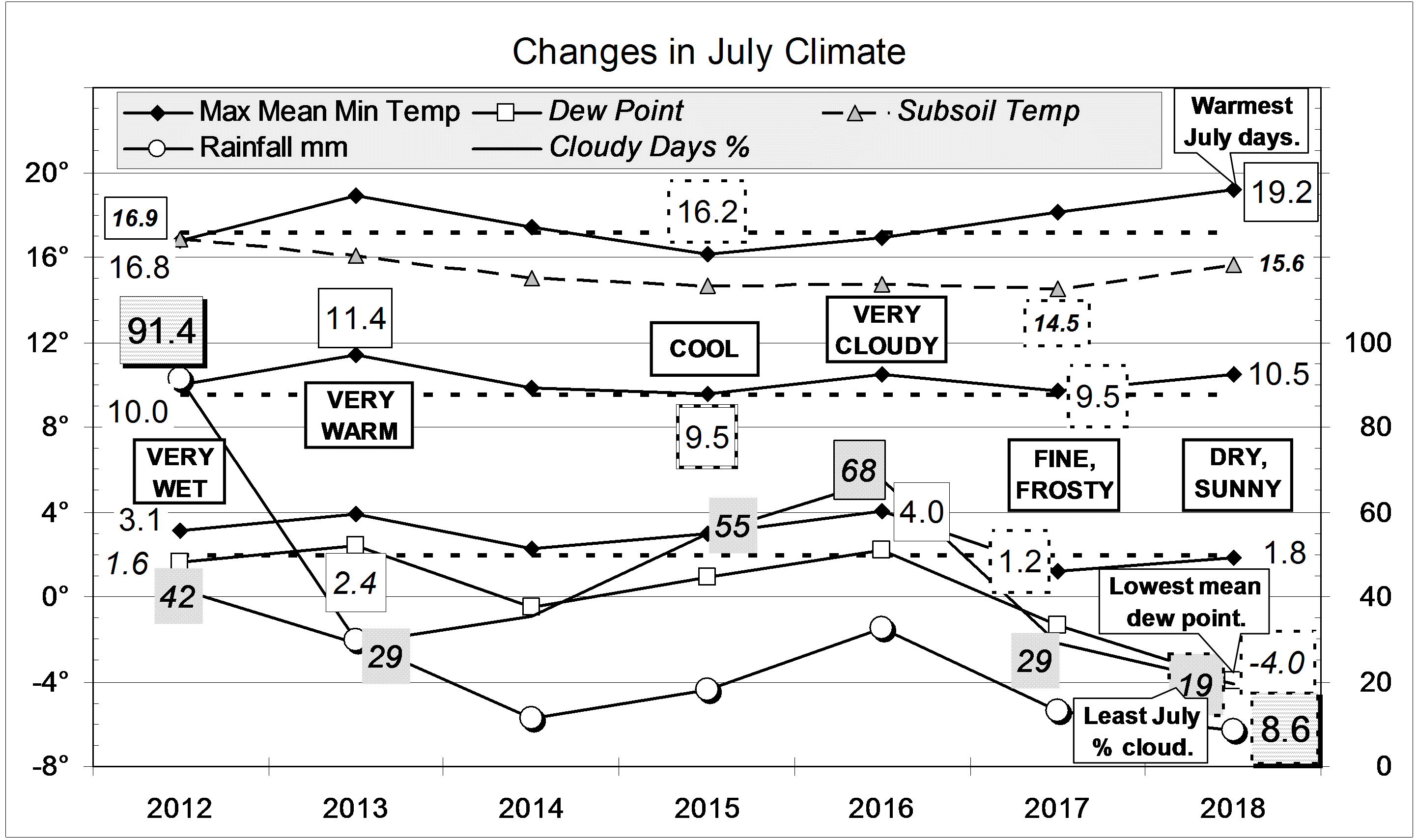 Published August 2, 2018 at 2884 × 1710 in July 2018 had deep frosts « Previous Graphical log of the last seven July months at Manilla, NSW, showing mean values of maximum, minimum and mean temperature, soil temperature, early morning dew point and cloudy days percent, and total monthly rainfall in millimetres.