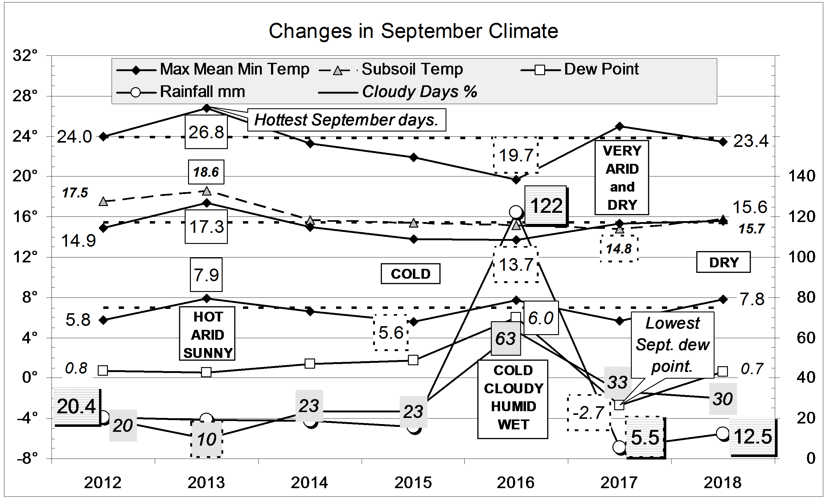 Published October 3, 2018 at 2679 × 1617 in Dry and Mild September 2018 « Previous Graphical log of the last seven September months at Manilla, NSW, showing mean values of maximum, minimum and mean temperature, soil temperature, early morning dew point and cloudy days percent, and total monthly rainfall in millimetres.