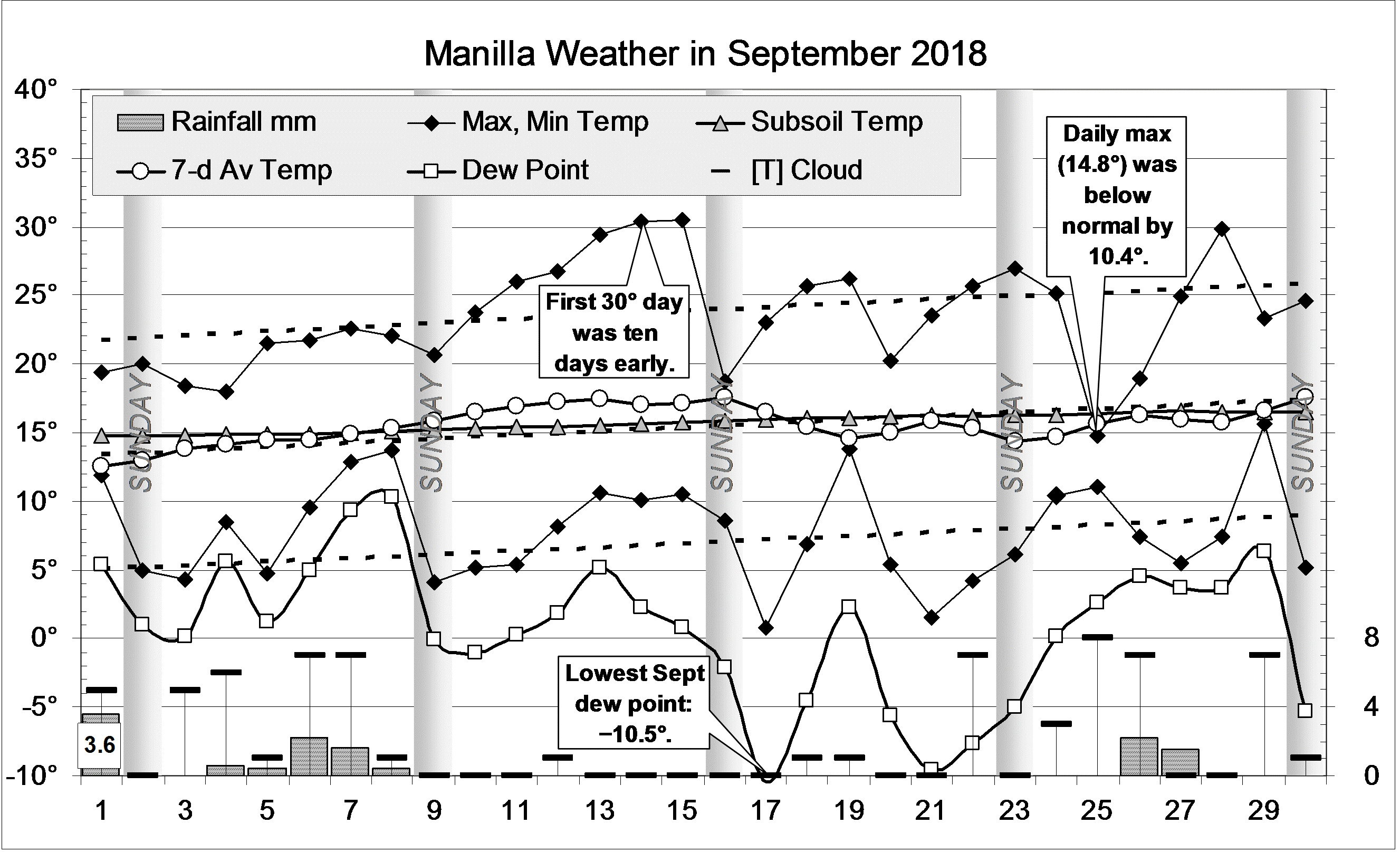 Published October 3, 2018 at 2654 × 1615 in Dry and Mild September 2018 « Previous Next » Graphical log, for September 2018, of daily values of maximum and minimum temperatures, subsoil (750mm) temperature and early morning dew point (all in degrees Celsius), rainfall (mm) and cloud amount (octas). Weekly mean temperature also shown.