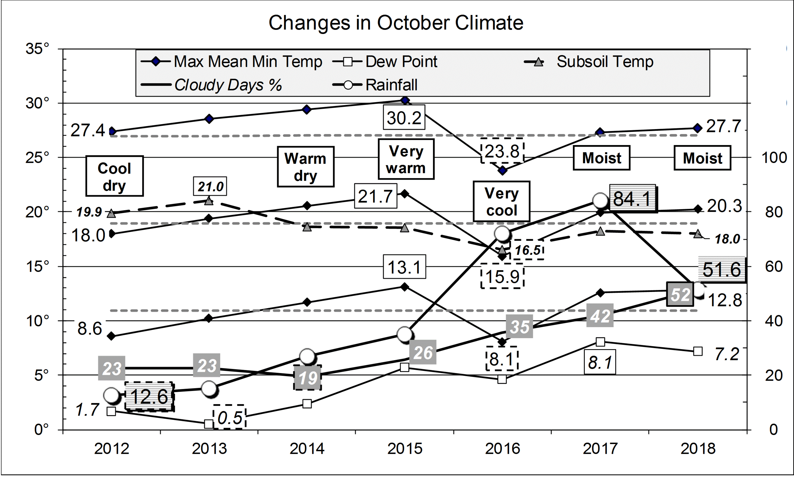 Published November 4, 2018 at 3176 × 1910 in Moist October 2018 « Previous Graphical log of the last seven October months at Manilla, NSW, showing mean values of maximum, minimum and mean temperature, soil temperature, early morning dew point and cloudy days percent, and total monthly rainfall in millimetres.