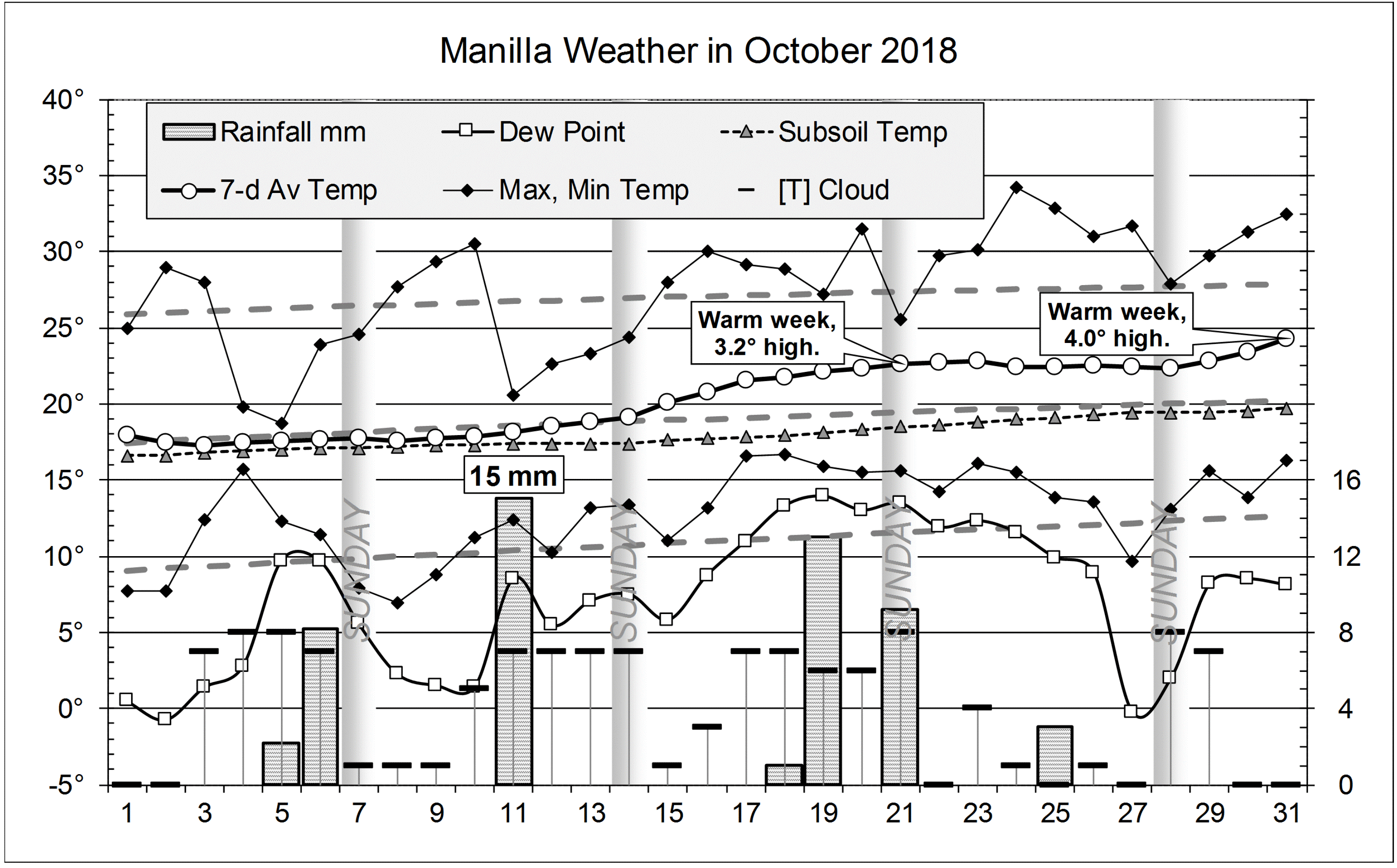 Published November 4, 2018 at 3184 × 1979 in Moist October 2018 « Previous Next » Graphical log, for October 2018, of daily values of maximum and minimum temperatures, subsoil (750mm) temperature and early morning dew point (all in degrees Celsius), rainfall (mm) and cloud amount (octas). Weekly mean temperature also shown.