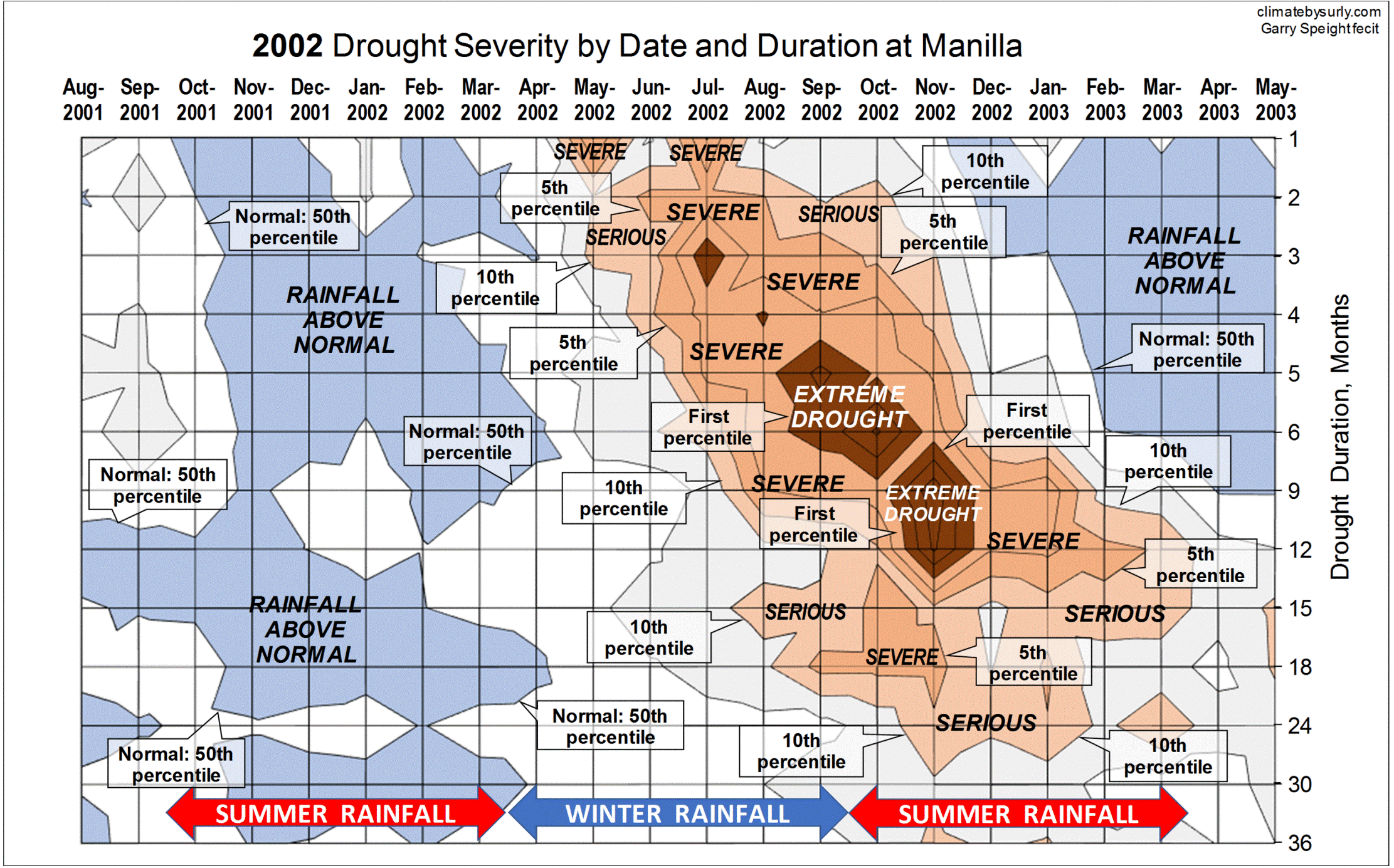 Published November 17, 2018 at 2223 × 1385 in The 2002 drought contour chart « Previous A chart of the severity of the 2002 drought at Manilla NSW by date and by duration.