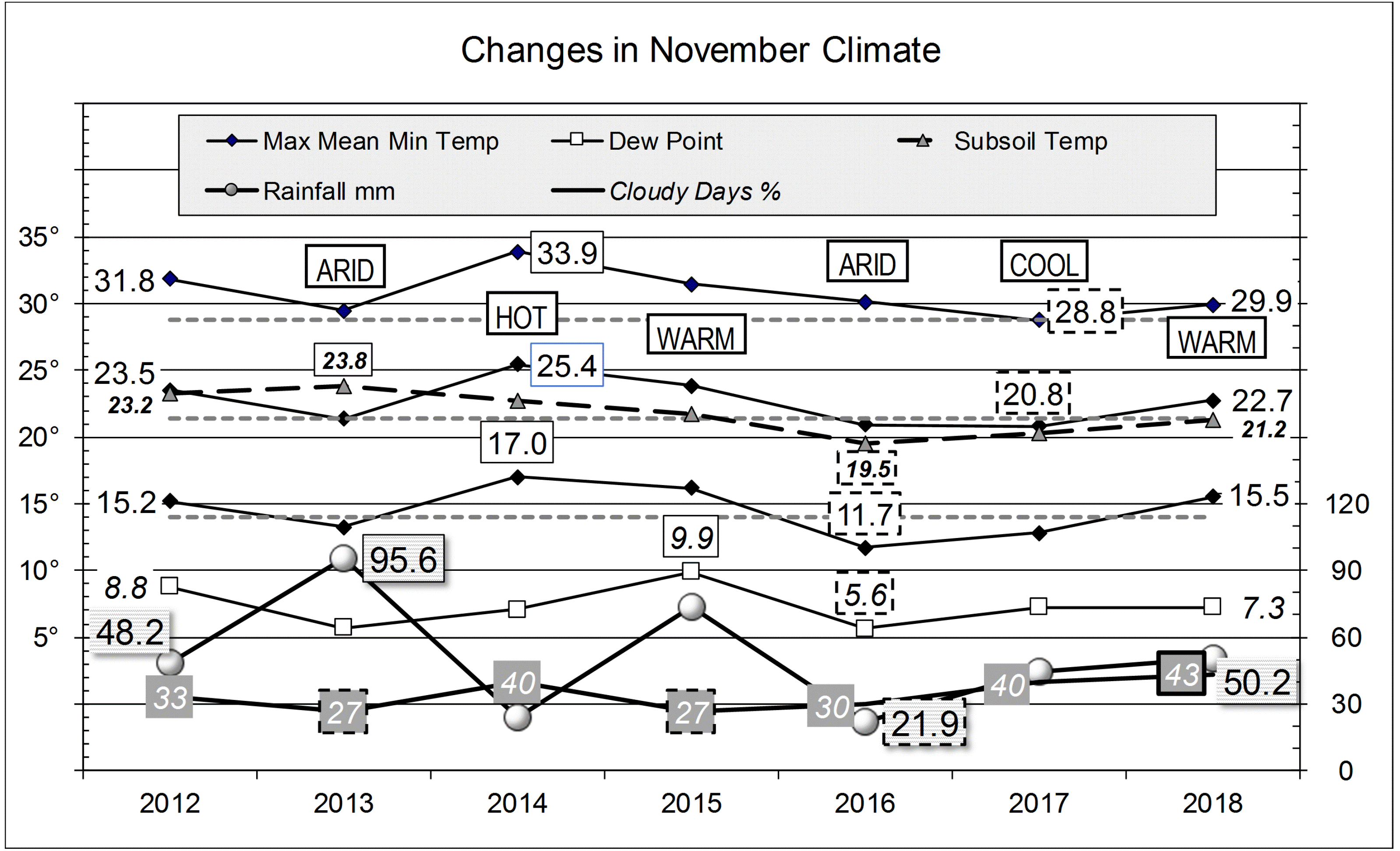 Published December 2, 2018 at 3197 × 1944 in November 2018 began hot « Previous Graphical log of the last seven November months at Manilla, NSW, showing mean values of maximum, minimum and mean temperature, soil temperature, early morning dew point and cloudy days percent, and total monthly rainfall in millimetres.