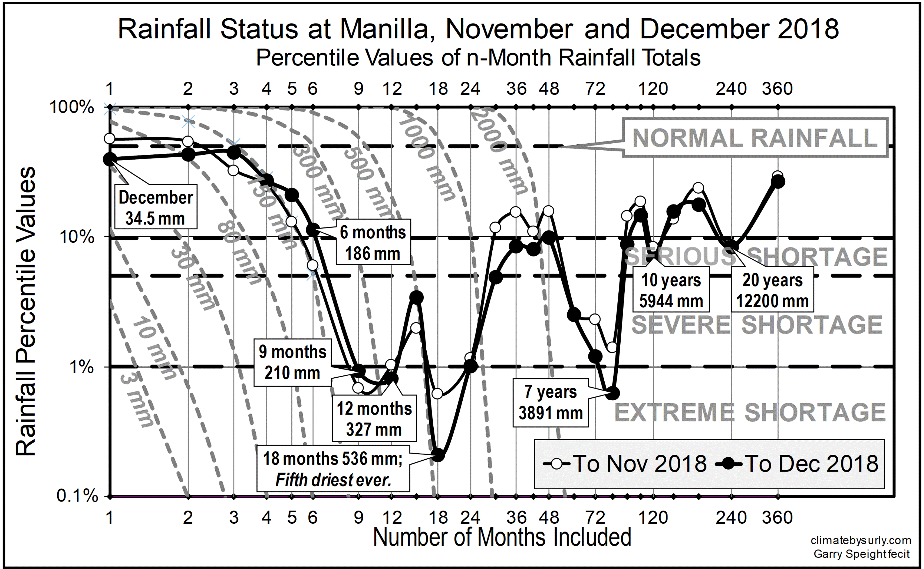Published December 31, 2018 at 3177 × 1957 in Driest 18 months in 50 years Graph showing shortages of rainfall at Manilla NSW at November and december 2018. Percentile values of periods of one month up to 360 months are shown. Percentiles are classed as extreme, severe, or serious.