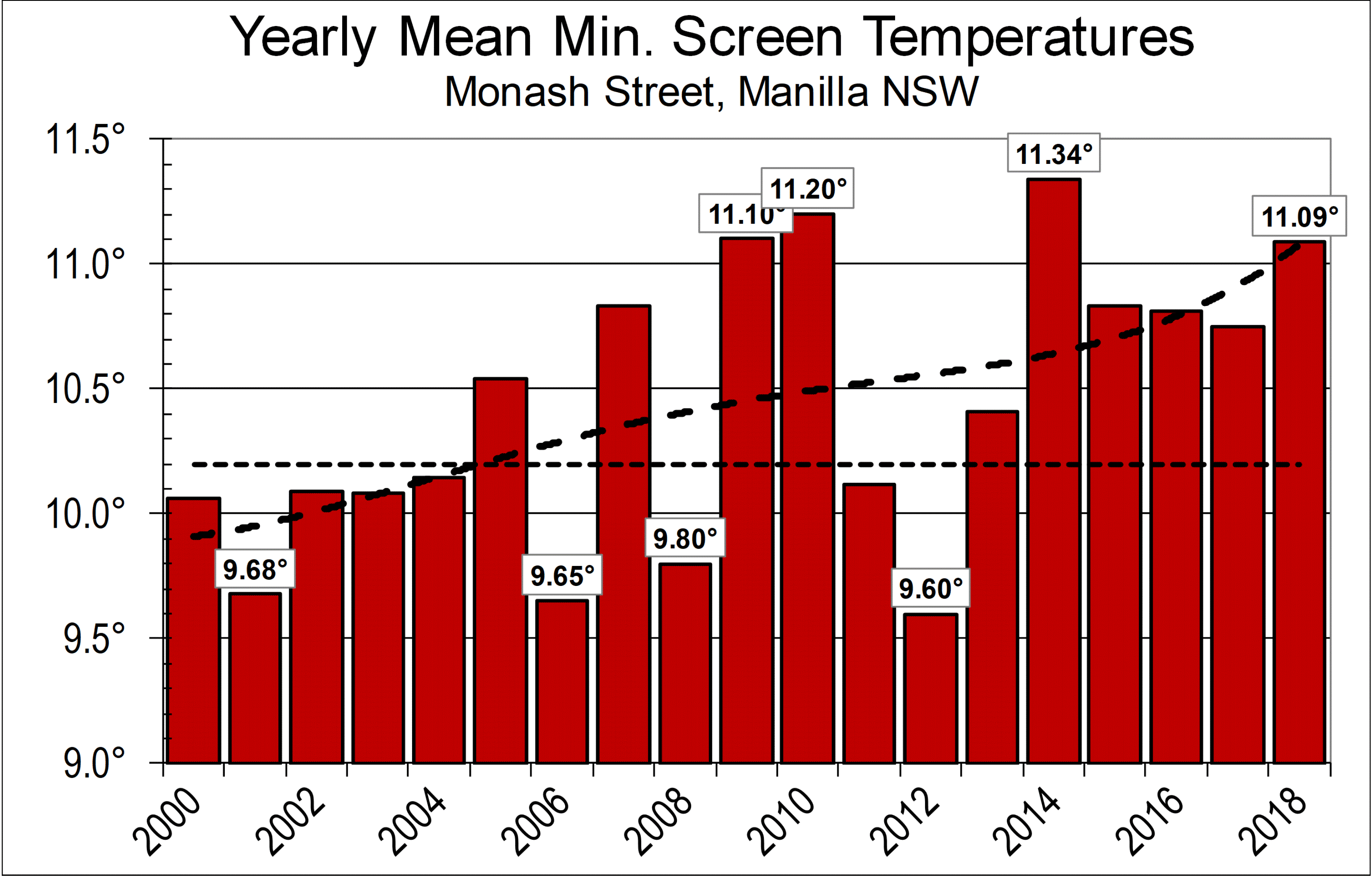 Published January 28, 2019 at 3156 × 2020 in 2018 hottest and driest « Previous Next » Log of 19 yearly values of daily minimum temperature at Manilla NSW.