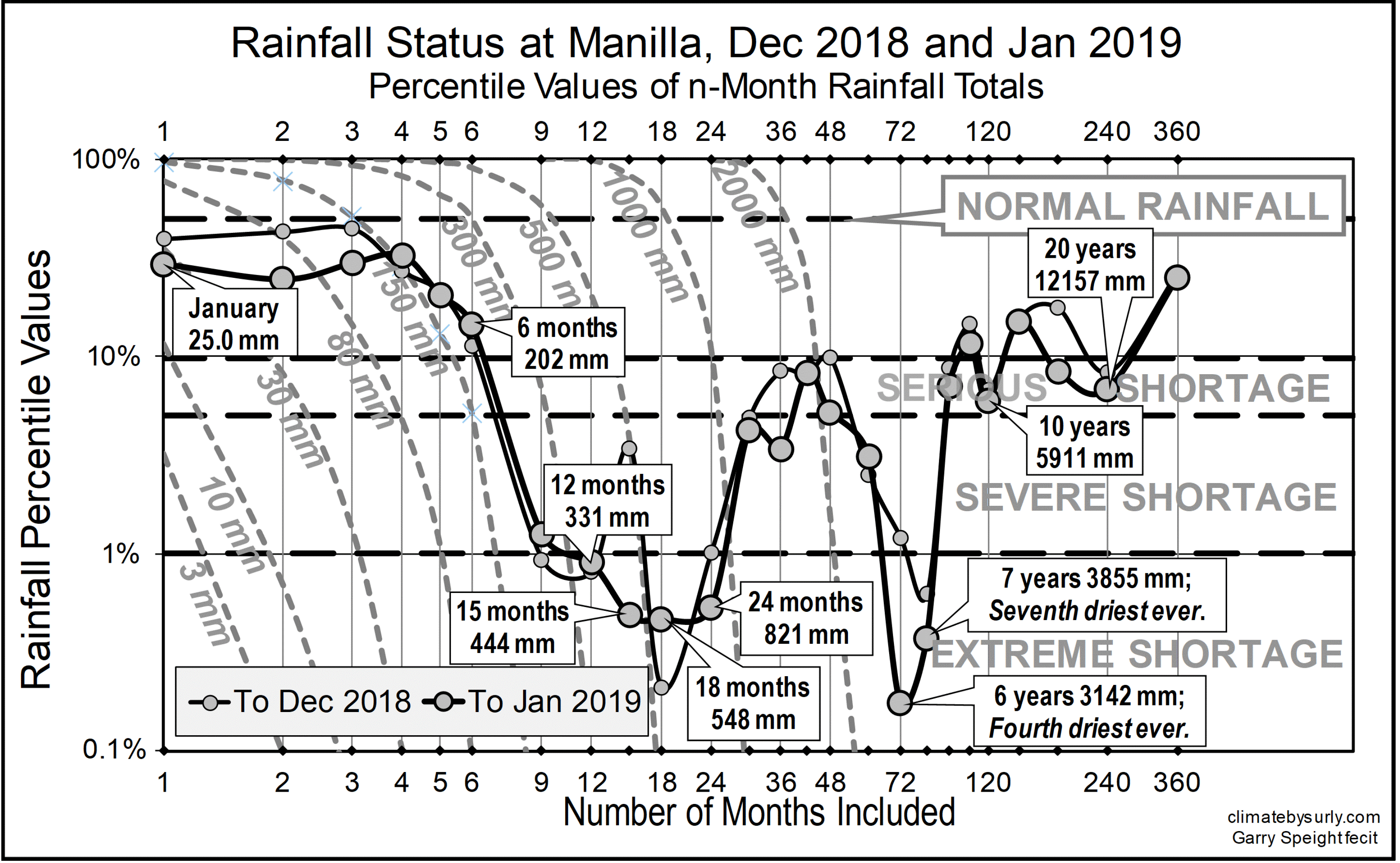 Published February 1, 2019 at 3198 × 1972 in Driest 6 years since 1903 Graph showing shortages of rainfall at Manilla NSW at December 2018 and January 2019. Percentile values of periods of one month up to 360 months are shown. Percentiles are classed as extreme, severe, or serious.