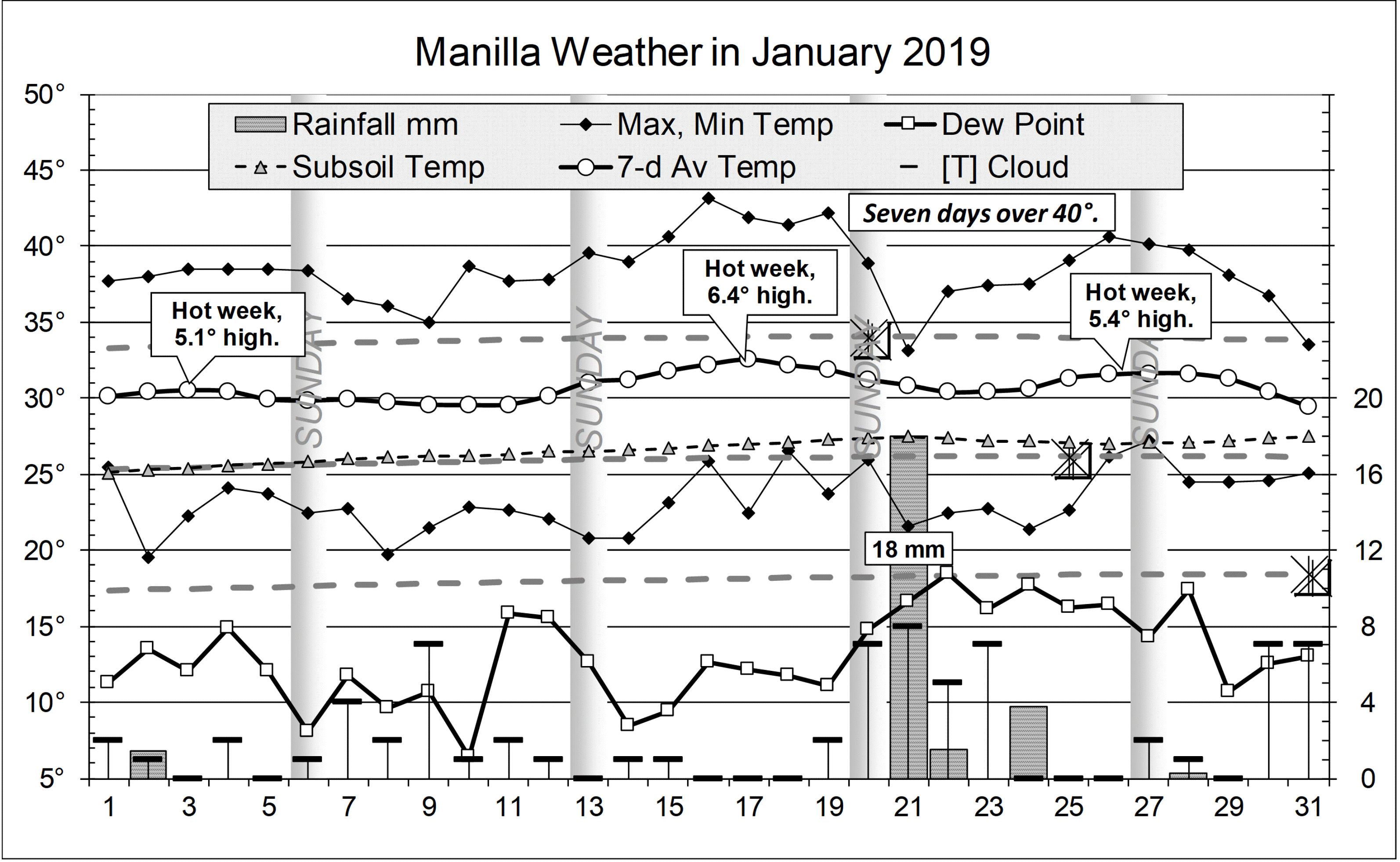 Published February 3, 2019 at 3187 × 1962 in January 2019 very hot « Previous Next » Graphical log, for January 2019, of daily values of maximum and minimum temperatures, subsoil (750 mm) temperature and early morning dew point (all in degrees Celsius), rainfall (mm) and cloud amount (octas). Weekly mean temperature also shown.