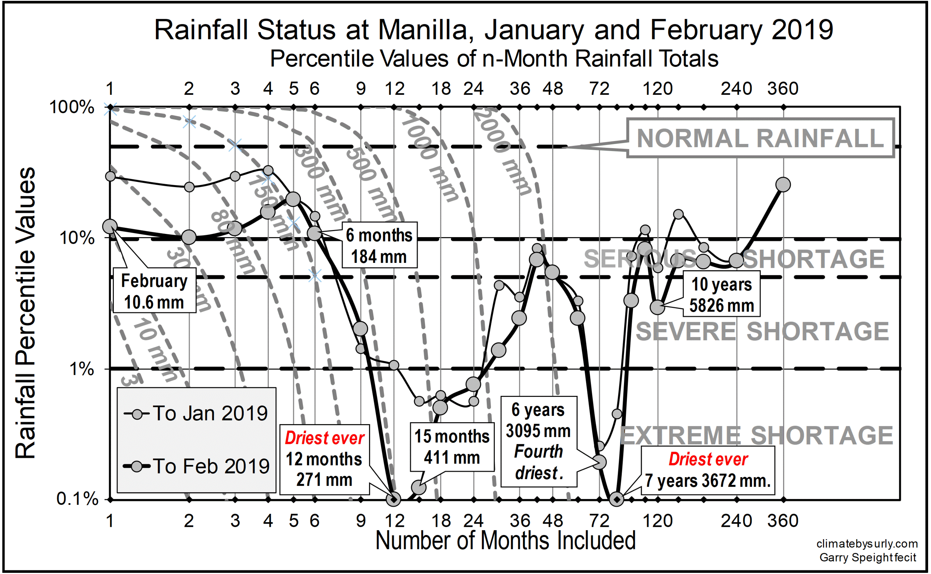 Published March 1, 2019 at 3218 × 1985 in February: Two Record Droughts Graph showing shortages of rainfall at Manilla NSW at December 2018 and January 2019. Percentile values of periods of one month up to 360 months are shown. Percentiles are classed as extreme, severe, or serious.