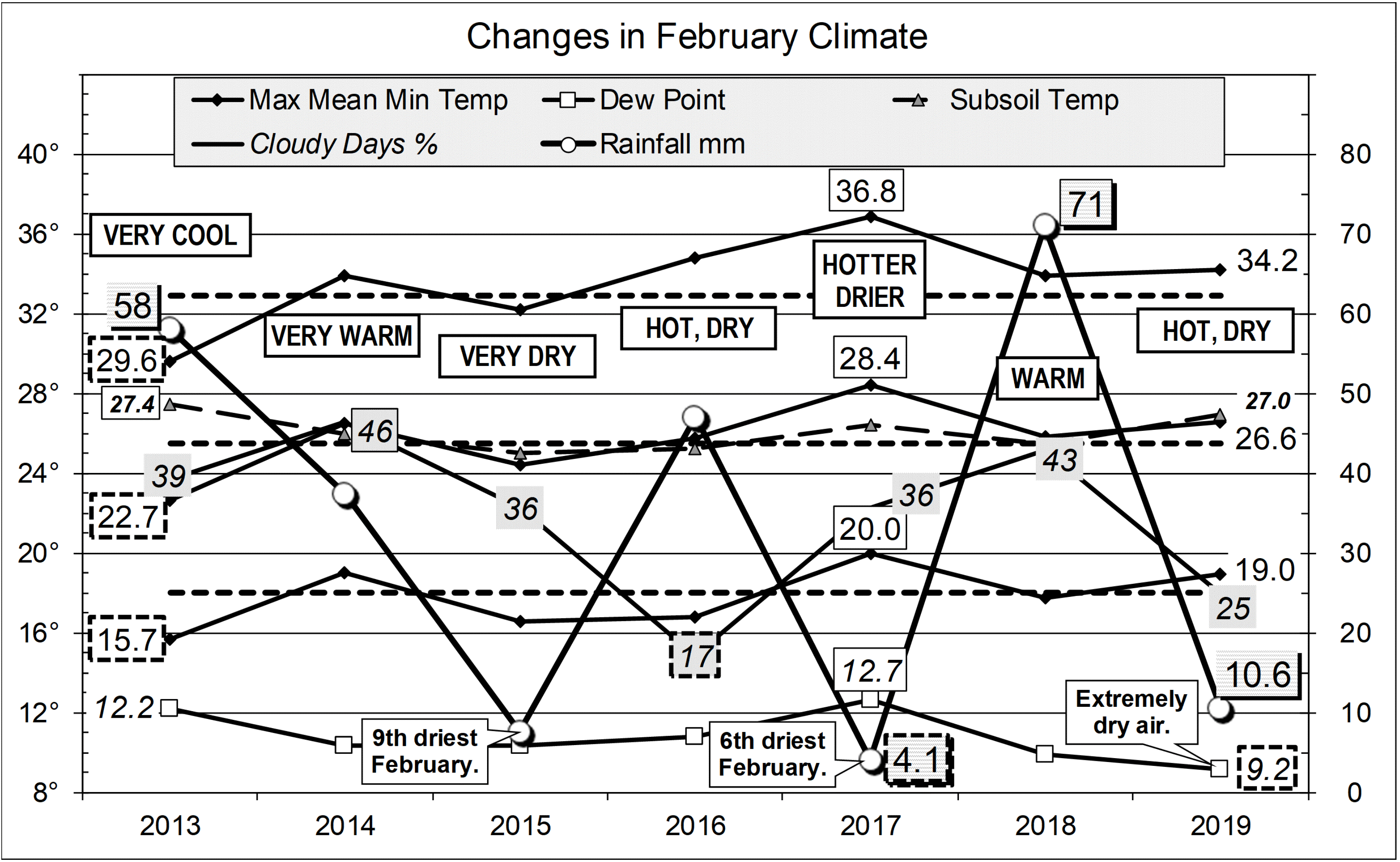 Published March 4, 2019 at 3219 × 1983 in Warm, Dry February 2019 « Previous Graphical log of the last seven February months at Manilla, NSW, showing mean values of maximum, minimum and mean temperature, soil temperature, early morning dew point and cloudy days percent, and total monthly rainfall in millimetres.