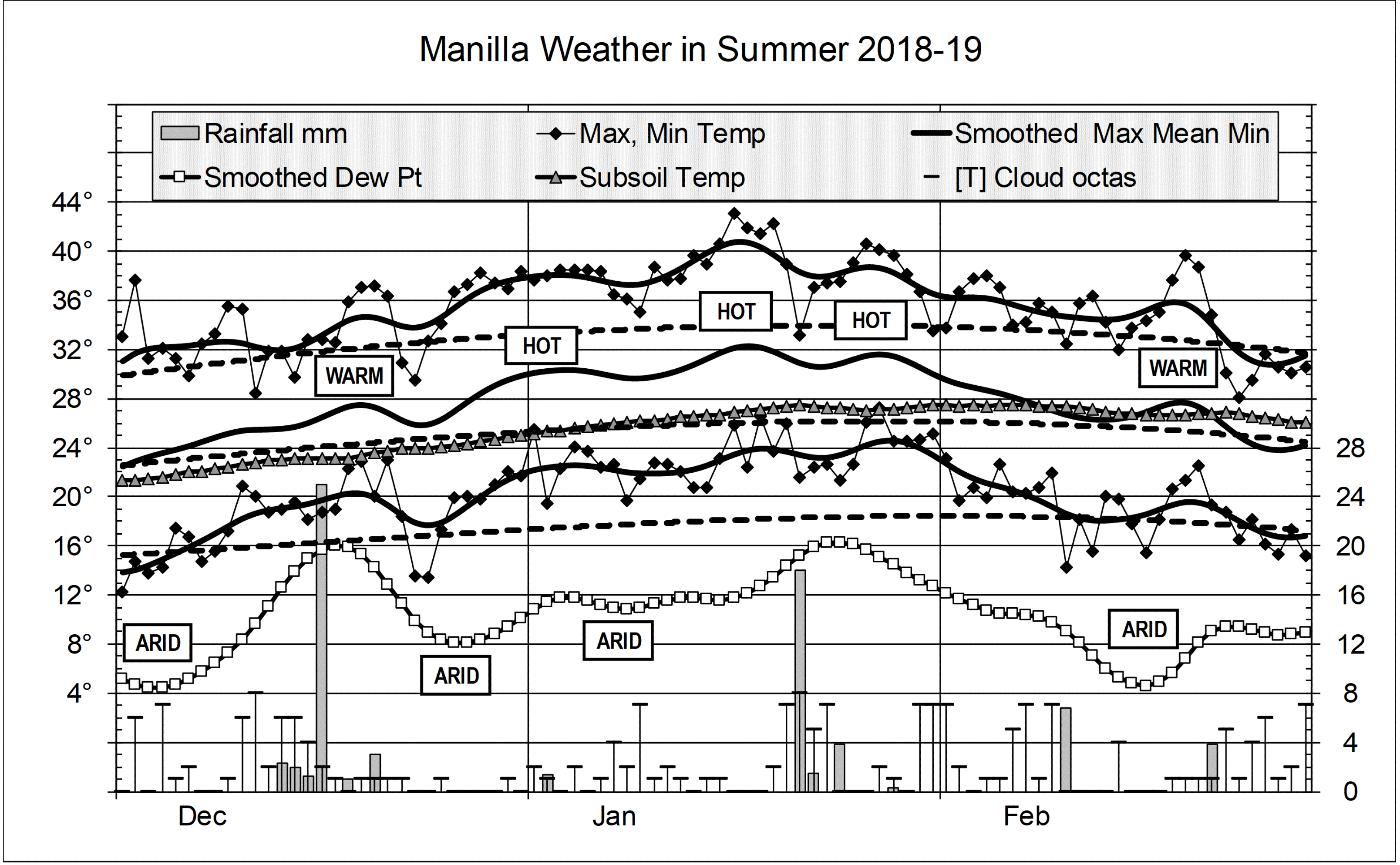 Graphical log, for summer (DJF) 2018-19 of daily values of maximum, minimum and mean temperatures, subsoil (750mm) temperature (all in degrees Celsius), rainfall (mm) and cloud amount (octas). Smoothed values of temperature and early morning dew point use a Gaussian smoothing function with half-width 6 days.