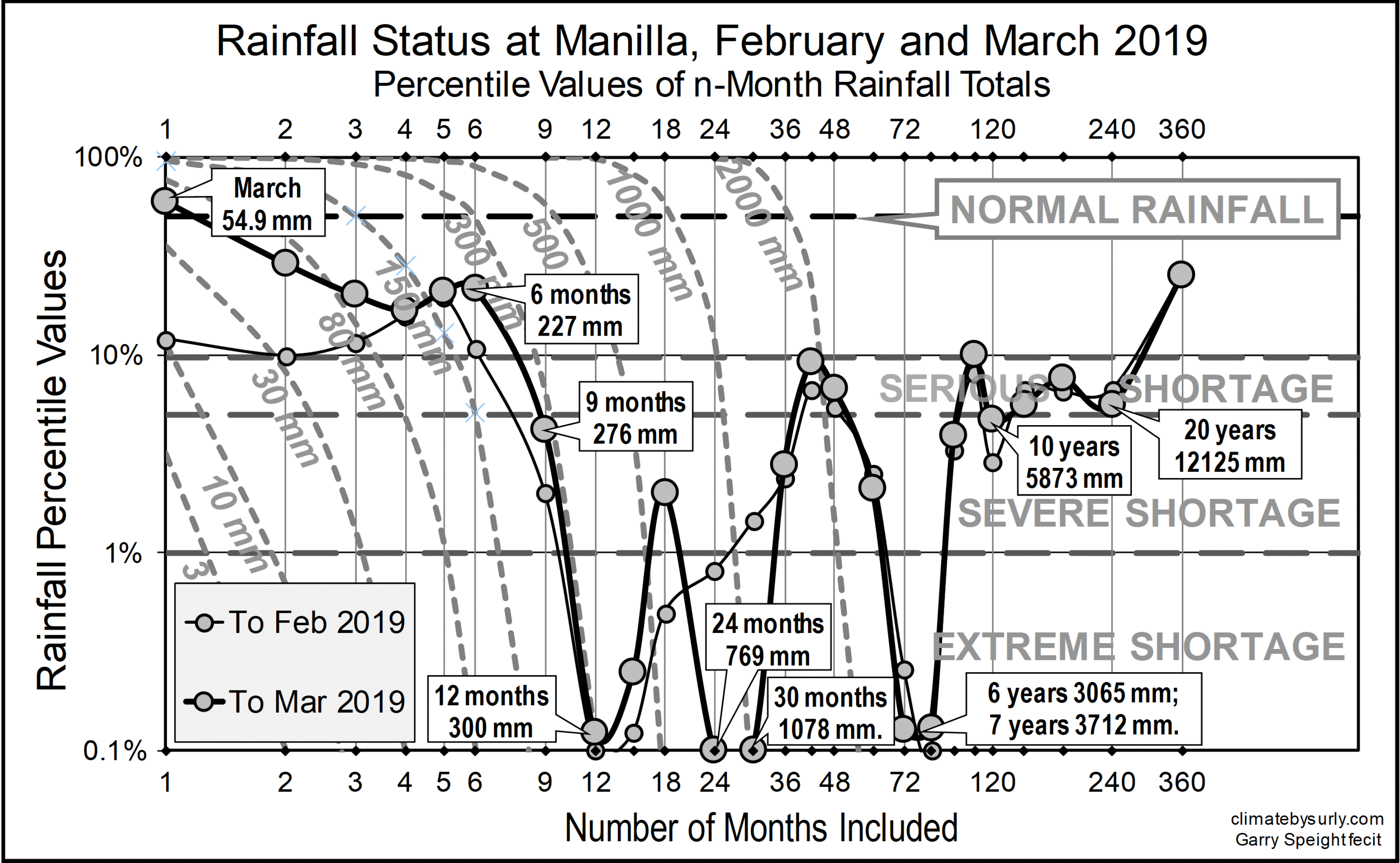 Published March 31, 2019 at 3179 × 1959 in March rain leaves drought extreme Graph showing shortages of rainfall at Manilla NSW at February and March 2019. Percentile values of periods of one month up to 360 months are shown. Percentiles are classed as extreme, severe, or serious.