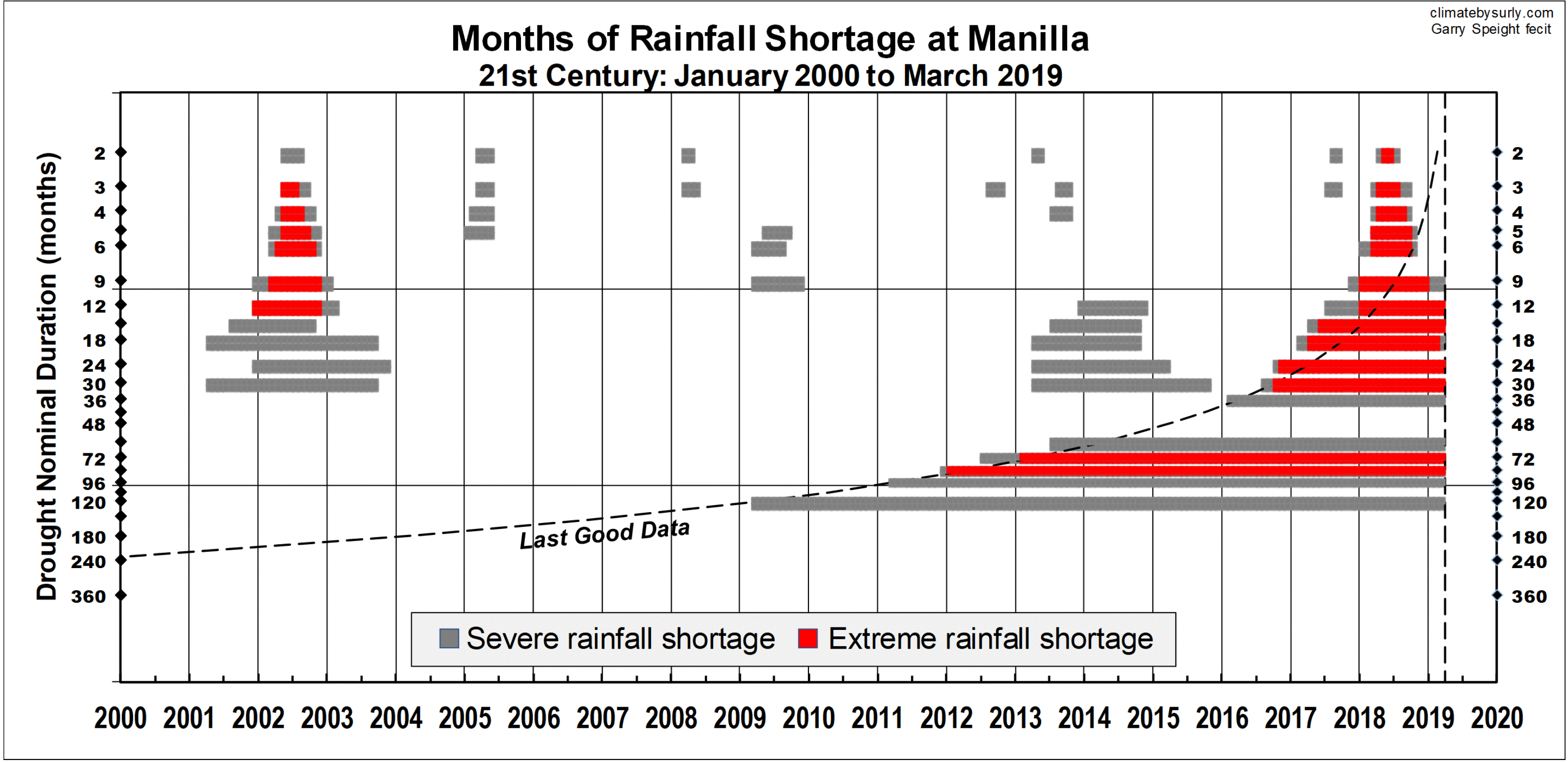 Published April 16, 2019 at 3169 × 1540 in Rainfall Shortage Jan 2000 – Mar 2019 Record of severe and extreme rainfall shortages at Manilla NSW from onset to breaking, from January 2000 to March 2019. All durations from 2 months to 360 months.