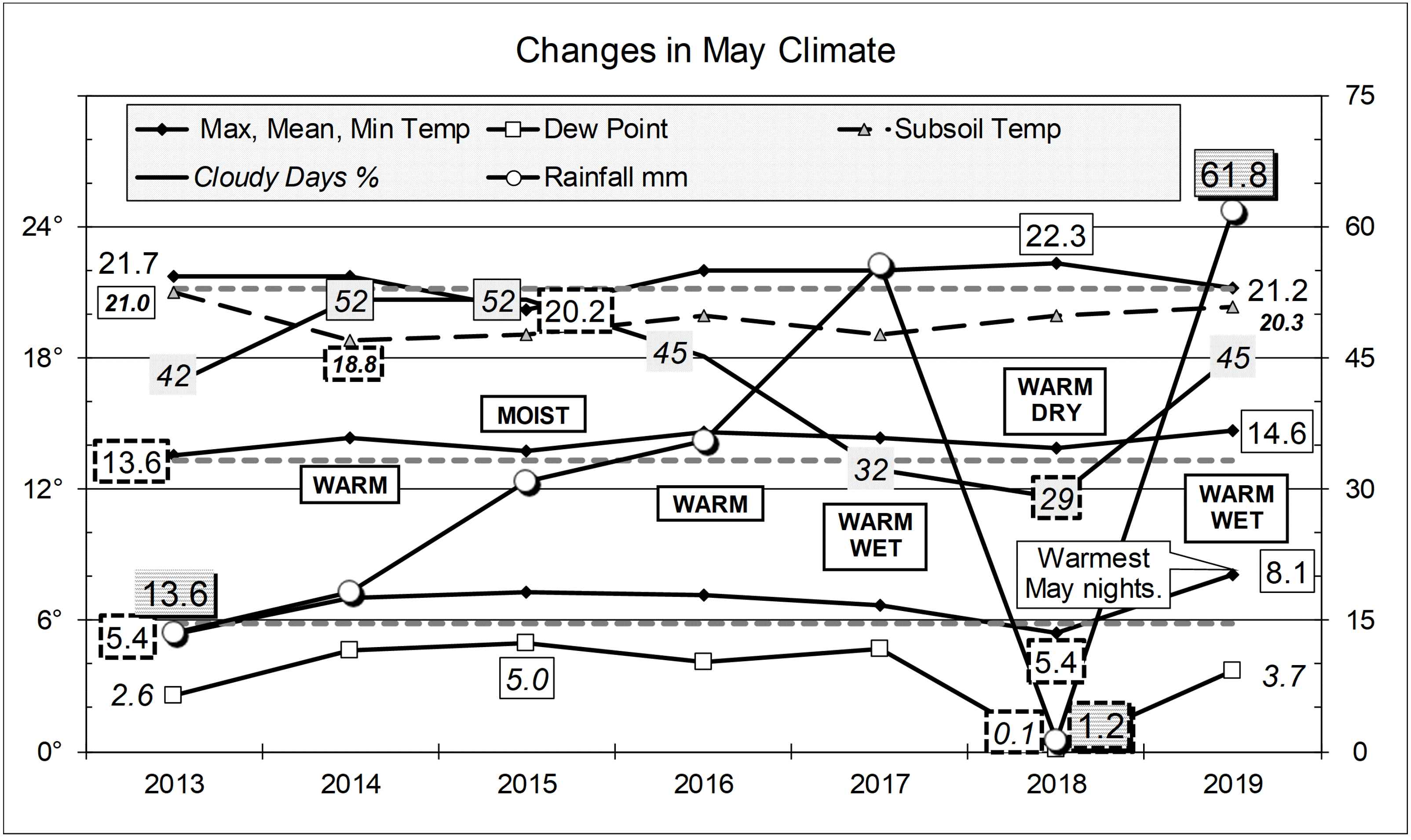 Published June 2, 2019 at 3208 × 1911 in May 2019 had the warmest nights « Previous Graphical log of the last seven May months at Manilla, NSW, showing mean values of maximum, minimum and mean temperature, soil temperature, early morning dew point and cloudy days percent, and total monthly rainfall in millimetres.