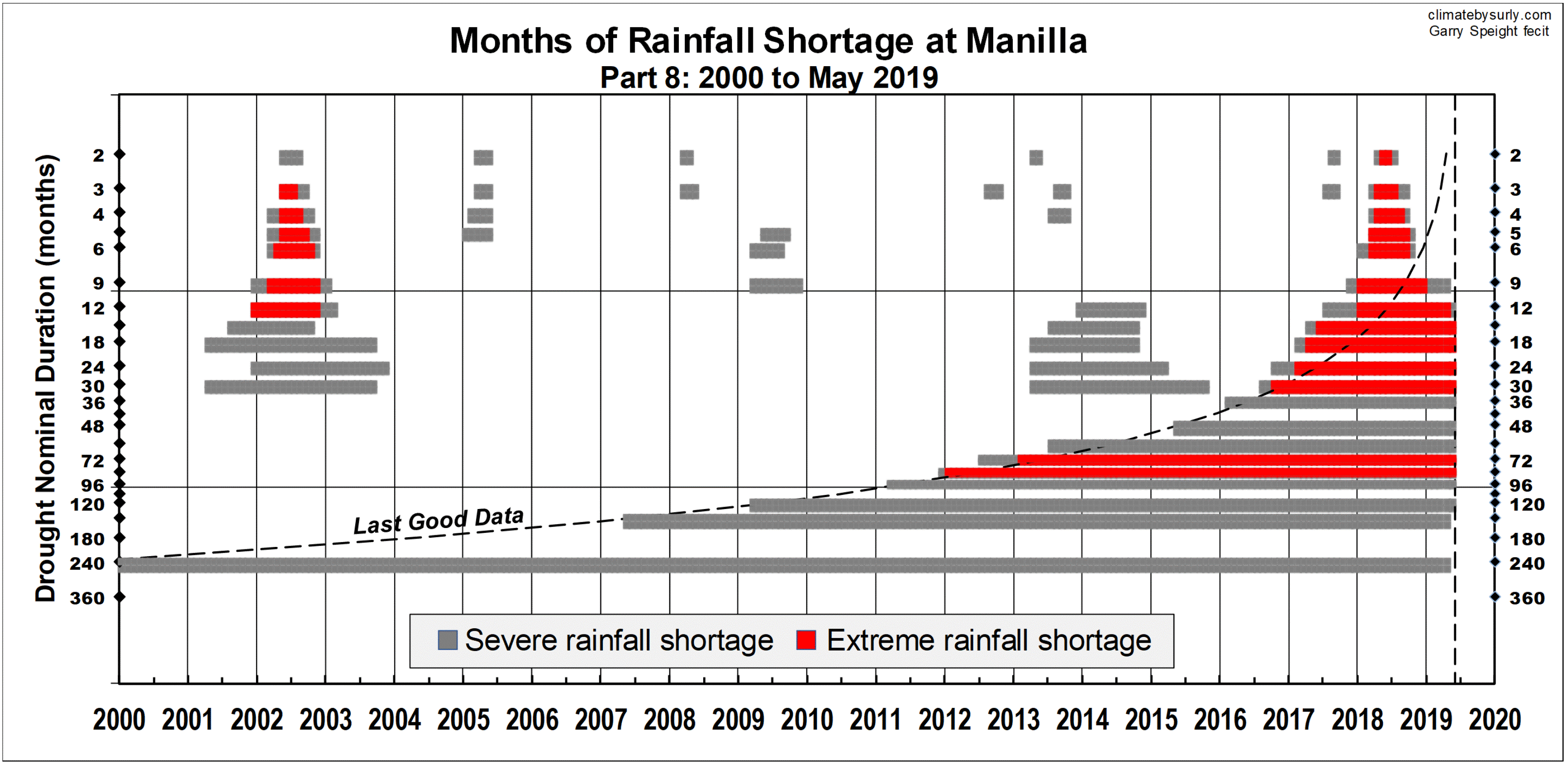 Published June 8, 2019 at 3222 × 1568 in Rain Shortage Jan 2000 – May 2019 Next » Record of severe and extreme rainfall shortages at Manilla NSW from onset to breaking, from January 2000 to May 2019. All durations from 2 months to 360 months.