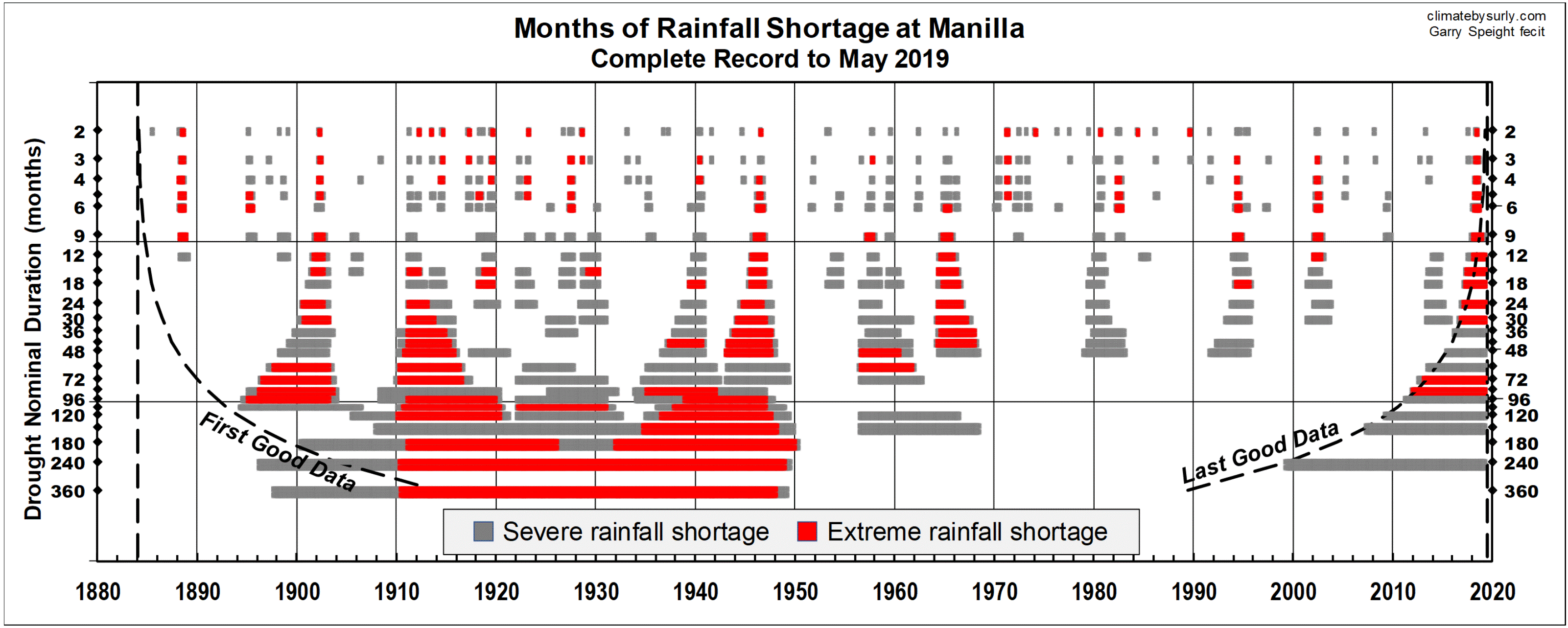 ComplMay19col Published June 8, 2019 at 3203 × 1283 in Rain Shortage Jan 2000 – May 2019 « Previous Complete record, to May 2019, of severe and extreme rainfall shortages at Manilla NSW from onset to breaking. All durations from 2 months to 360 months.