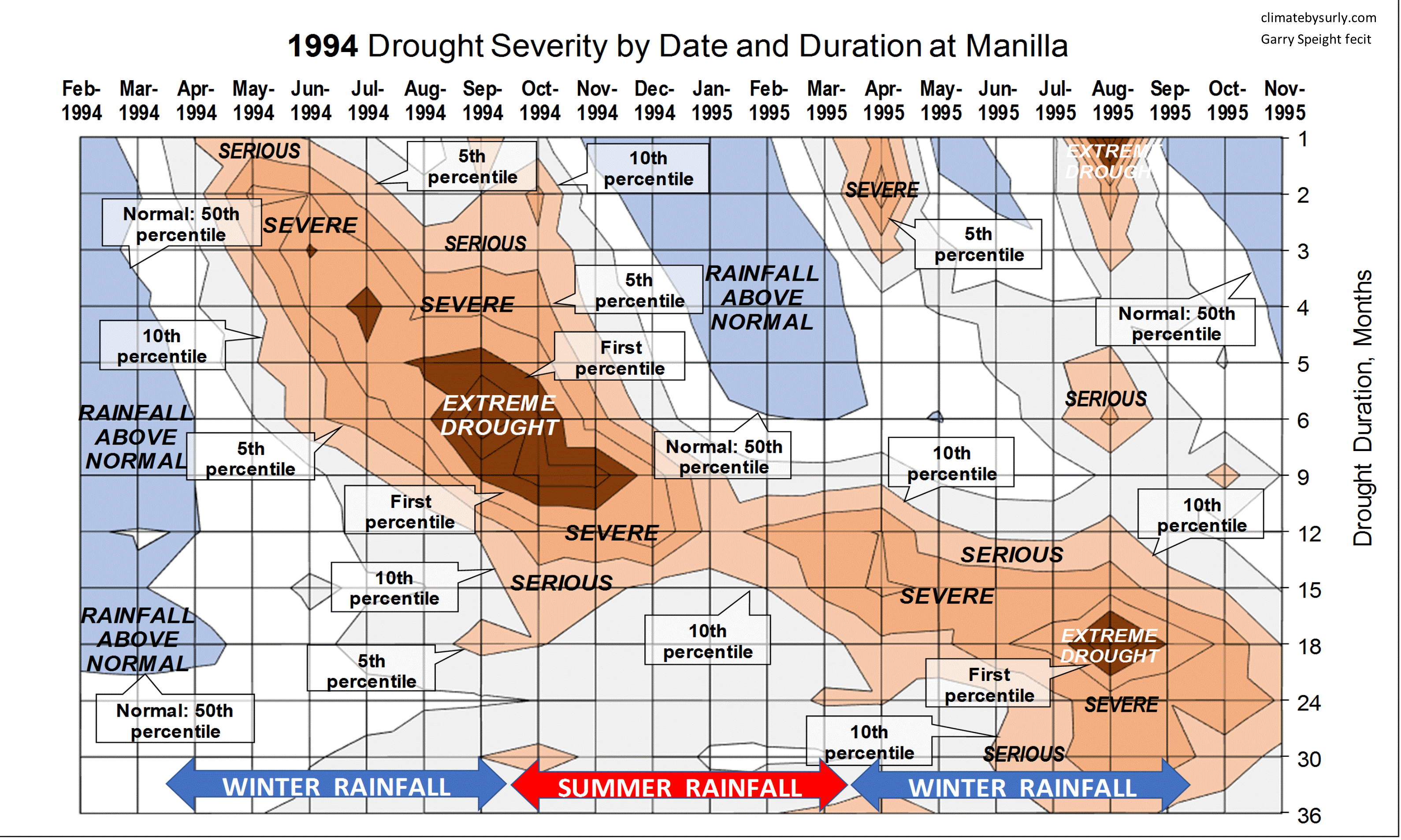 Published June 18, 2019 at 3179 × 1907 in Rainfall shortage: series of contour plots A contour plot of the percentile severity of the rainfall shortages at Manilla NSW by date and by duration. It shows the sequence of 22 months to November 1995.