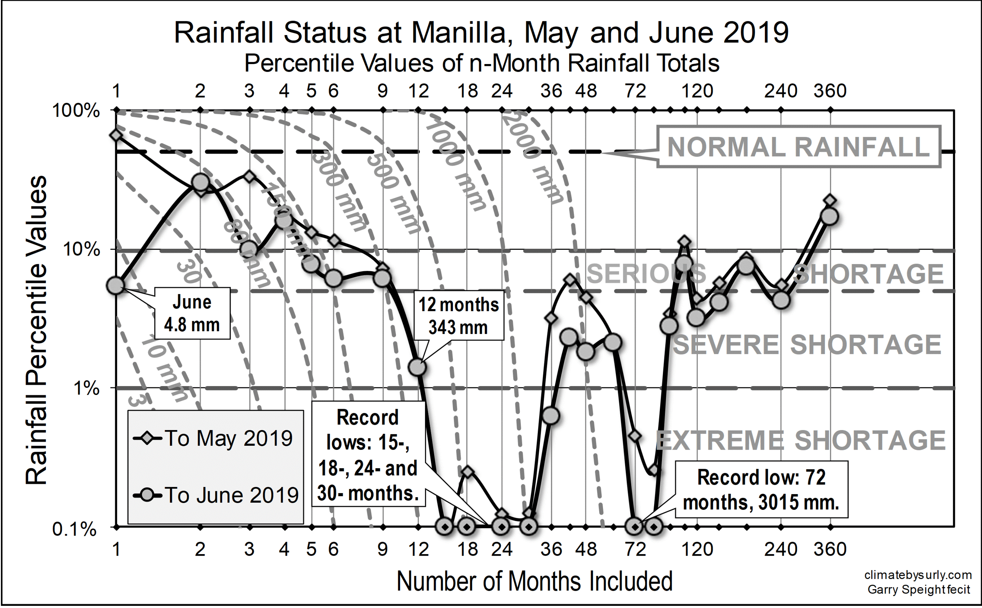 Published July 1, 2019 at 3189 × 1975 in June breaks more drought records Graph showing shortages of rainfall at Manilla NSW at May and June 2019. Percentile values of periods of one month up to 360 months are shown. Percentiles are classed as extreme, severe, or serious.