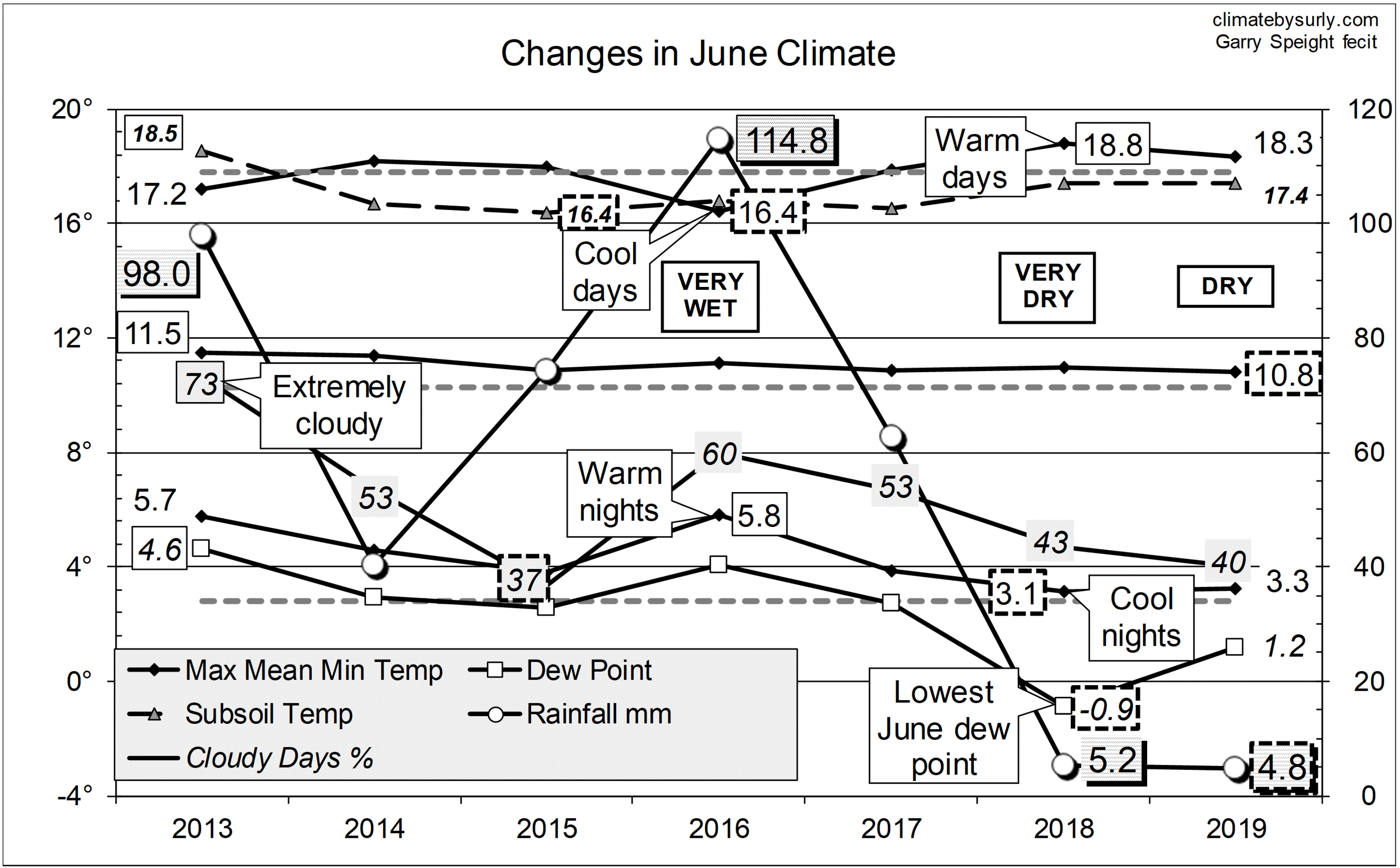 Published July 9, 2019 at 3206 × 1988 in June 2019 still warm and dry « Previous Graphical log of the last seven June months at Manilla, NSW, showing mean values of maximum, minimum and mean temperature, soil temperature, early morning dew point and cloudy days percent, and total monthly rainfall in millimetres.