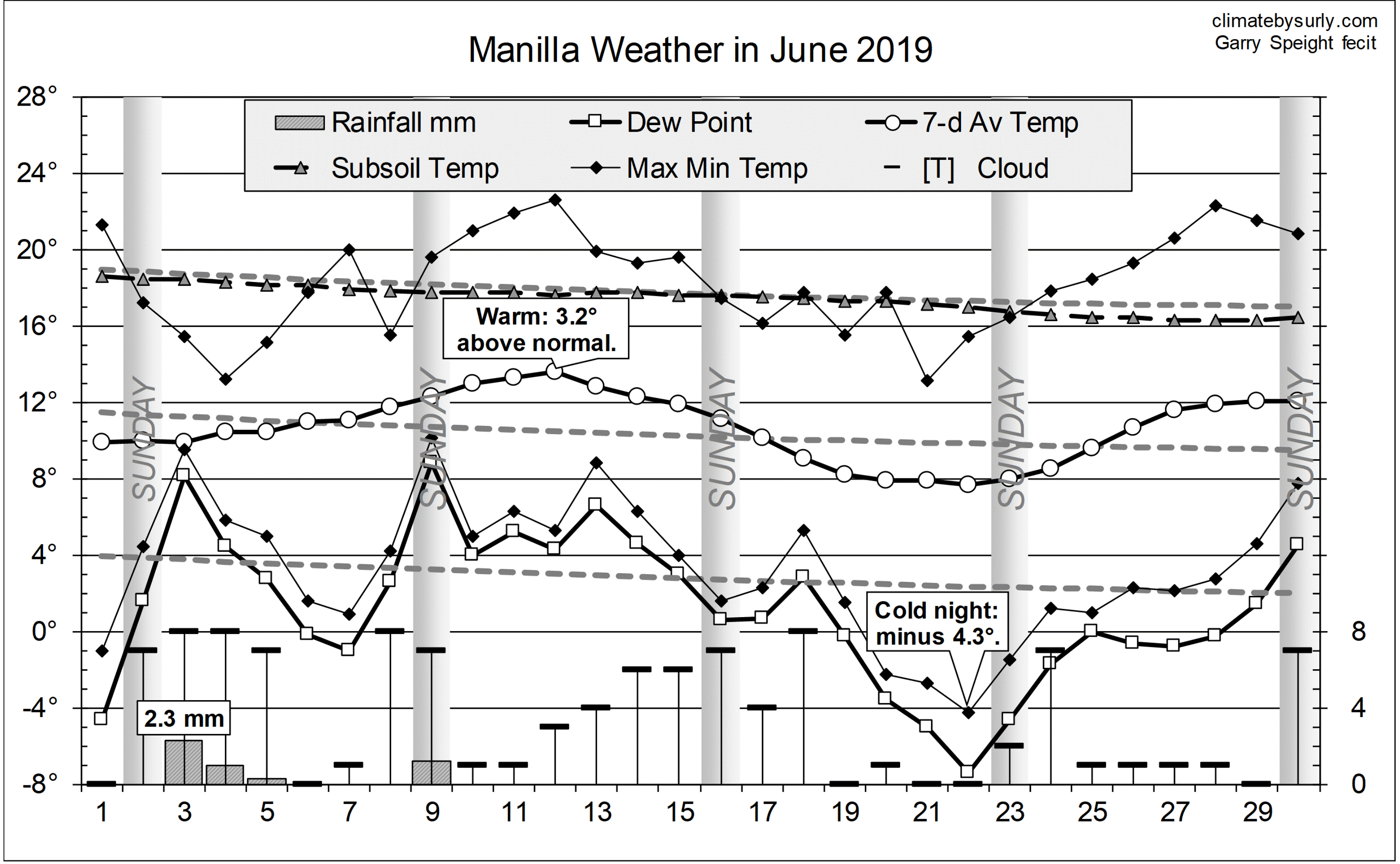 Published July 9, 2019 at 3218 × 1988 in June 2019 still warm and dry « Previous Next » Graphical log, for June 2019, of daily values of maximum and minimum temperatures, subsoil (750 mm) temperature and early morning dew point (all in degrees Celsius), rainfall (mm) and cloud amount (octas). Weekly mean temperature also shown.