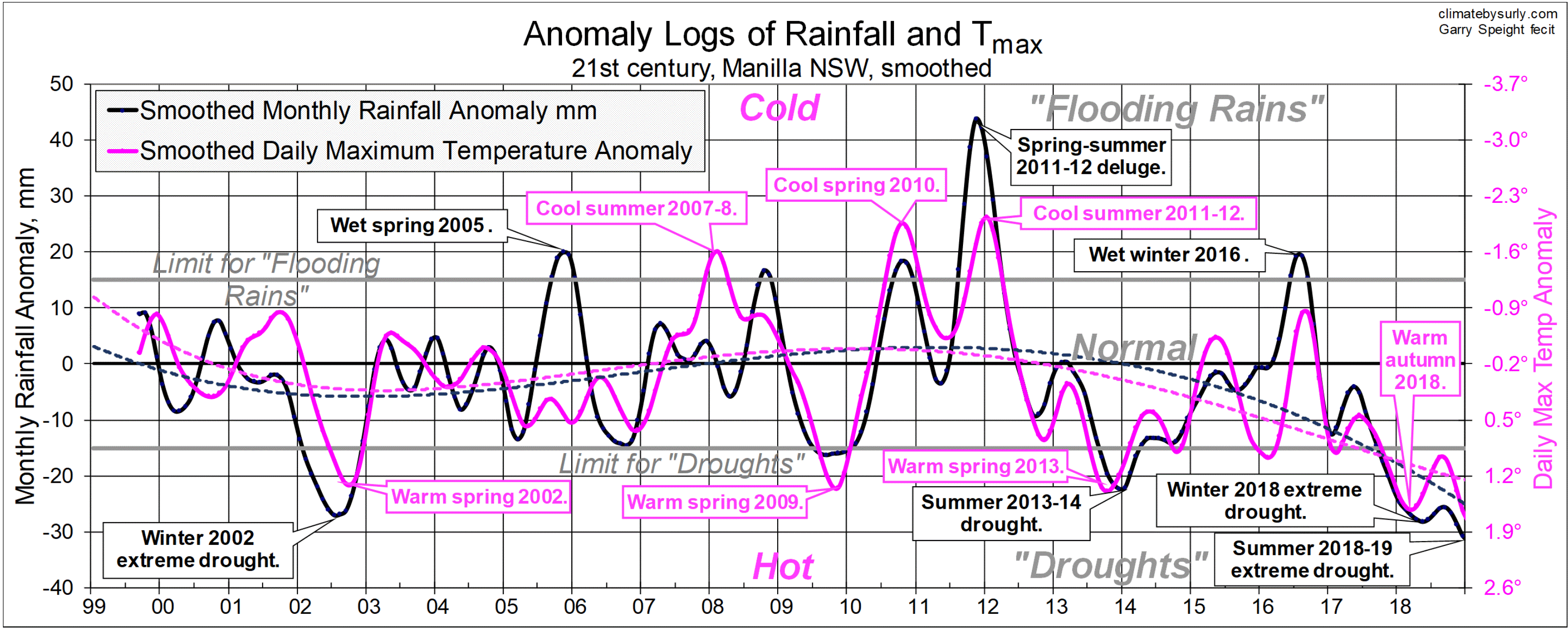 Mackellarfec Published July 29, 2019 at 3206 × 1287 in 21-C Climate: Mackellar cycles « Previous Smoothed rainfall and max temp log 1999 to 2018 for Manilla NSW, showing matching quasi-biennial cycles.
