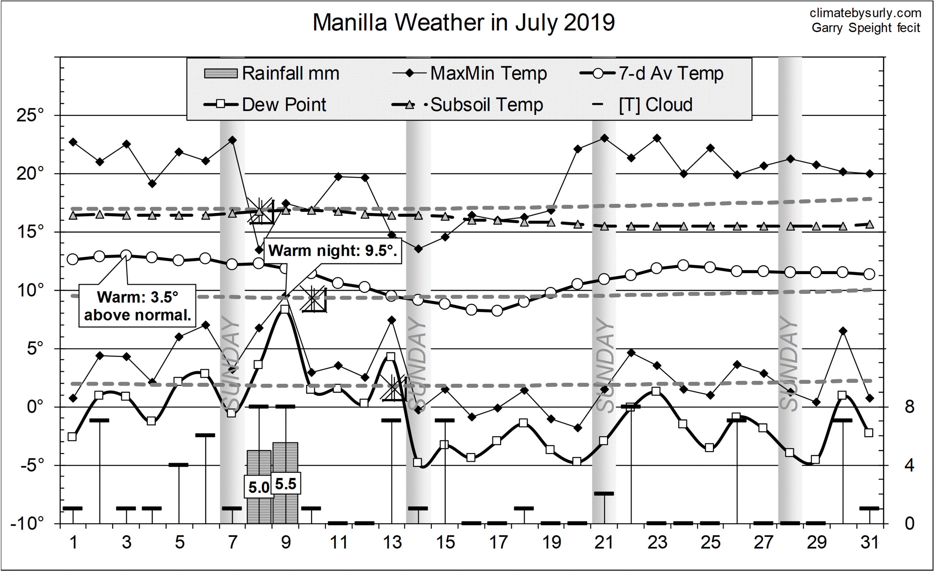 Published August 3, 2019 at 3211 × 1965 in July 2019 had the warmest days « Previous Next » Graphical log, for July 2019, of daily values of maximum and minimum temperatures, subsoil (750 mm) temperature and early morning dew point (all in degrees Celsius), rainfall (mm) and cloud amount (octas). Weekly mean temperature also shown.