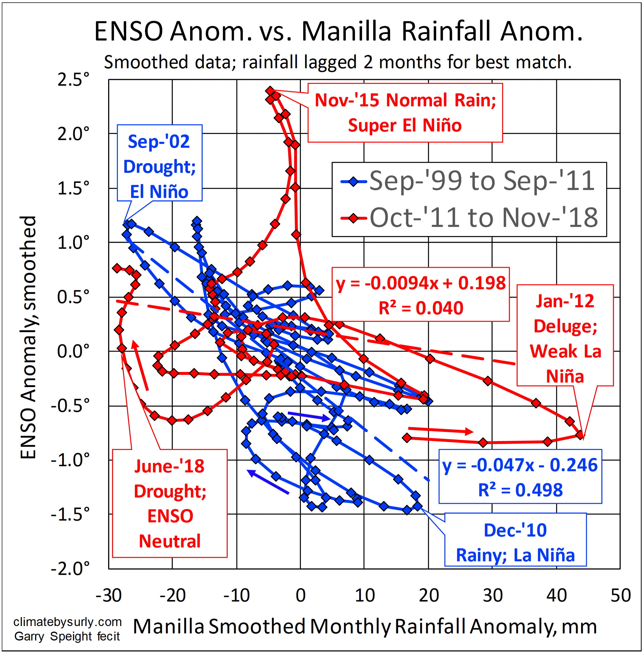 Published August 18, 2019 at 2181 × 2207 in 21-C Rain ENSO IPO: Scatterplot A connected scatterplot of ENSO smoothed versus Manilla rainfall smoothed and lagged.