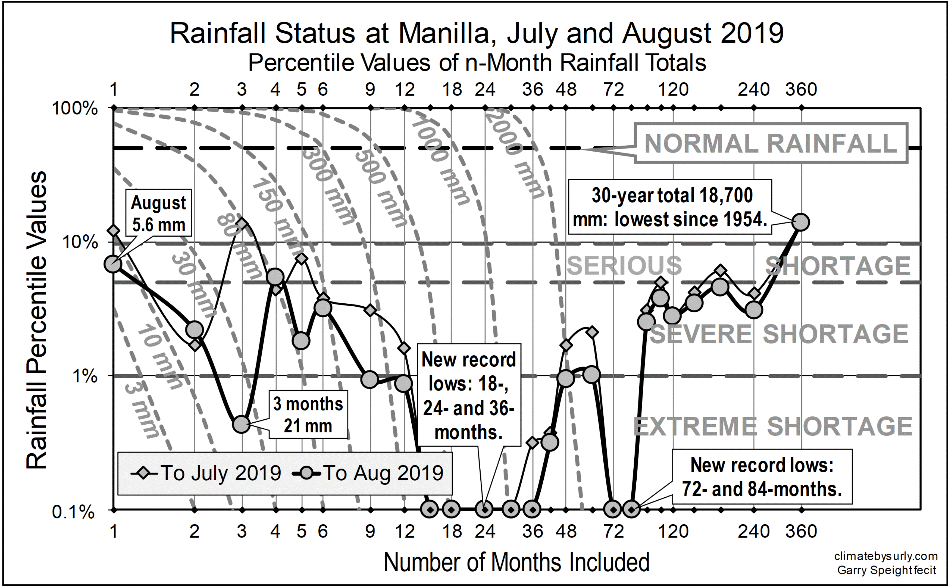 Published September 2, 2019 at 3203 × 1977 in New drought records in August 2019 Graph showing shortages of rainfall at Manilla NSW at July and august 2019. Percentile values of periods of one month up to 360 months are shown. Percentiles are classed as extreme, severe, or serious.