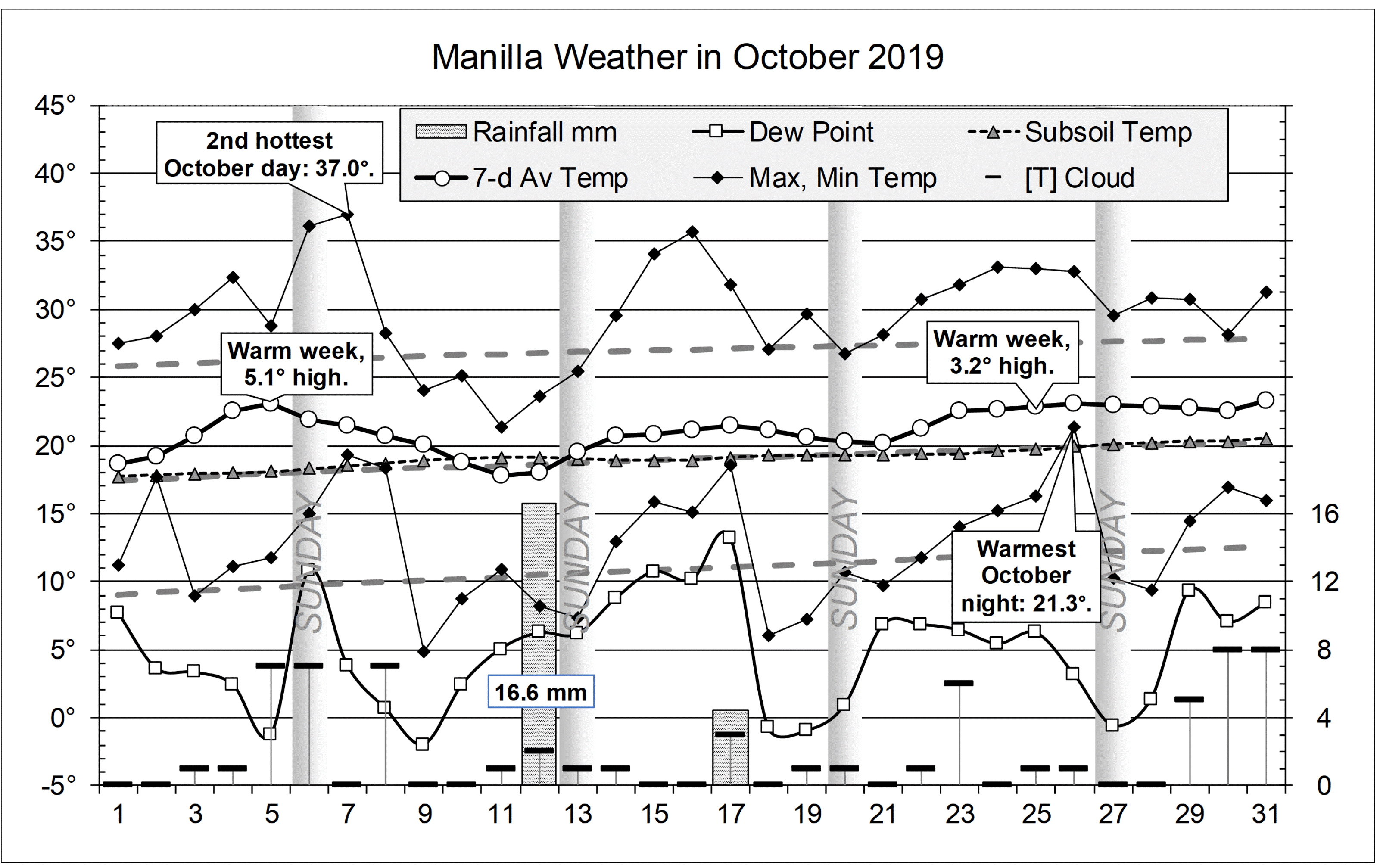 Published November 4, 2019 at 3203 × 2015 in Warm, dry October 2019 « Previous Next » Graphical log, for October 2019, of daily values of maximum and minimum temperatures, subsoil (750 mm) temperature and early morning dew point (all in degrees Celsius), rainfall (mm) and cloud amount (octas). Weekly mean temperature also shown.