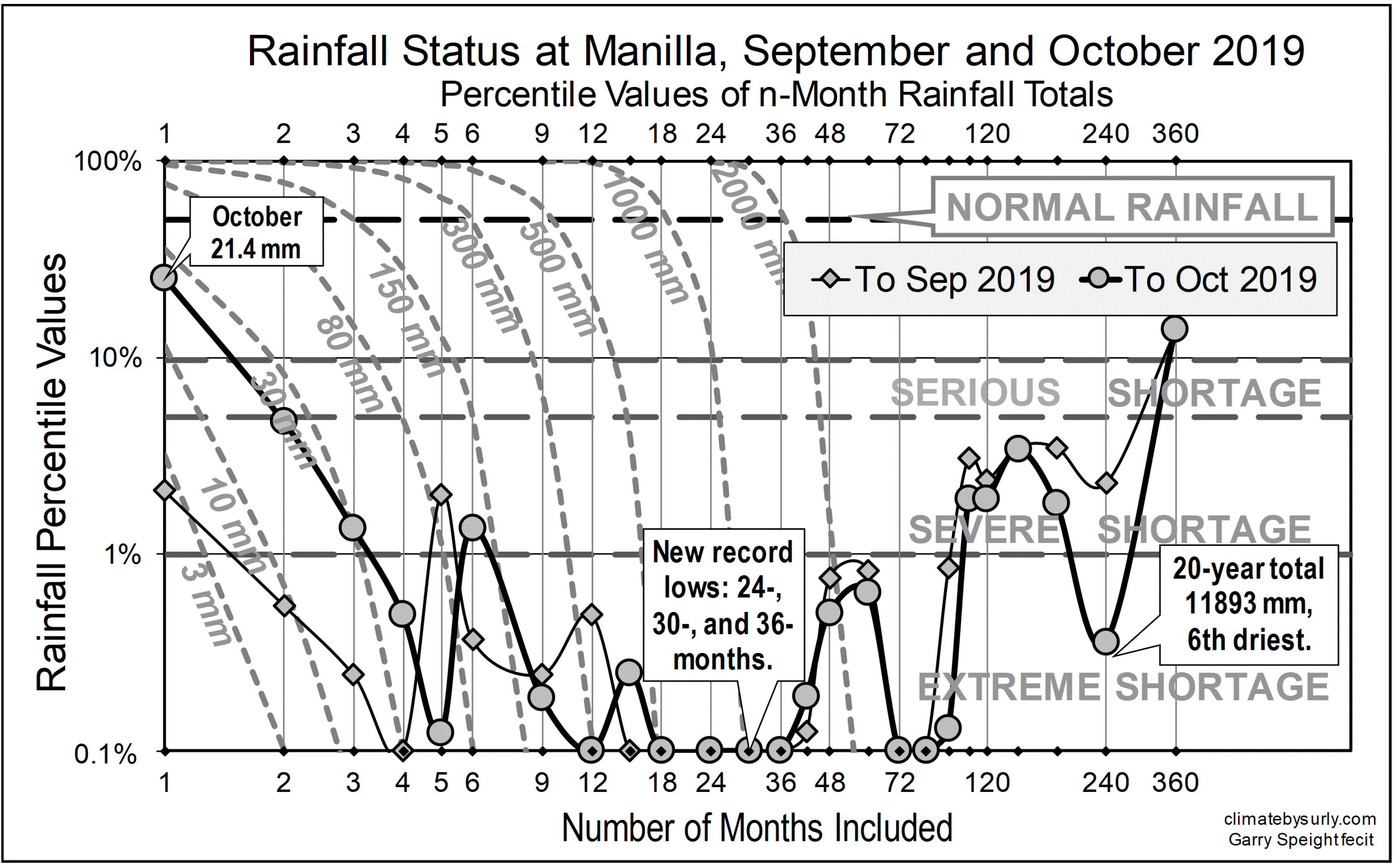 Published November 9, 2019 at 3193 × 1986 in October: 20-year extreme shortage Graph showing shortages of rainfall at Manilla NSW at September and October 2019. Percentile values of periods of one month up to 360 months are shown. Percentiles are classed as extreme, severe, or serious.