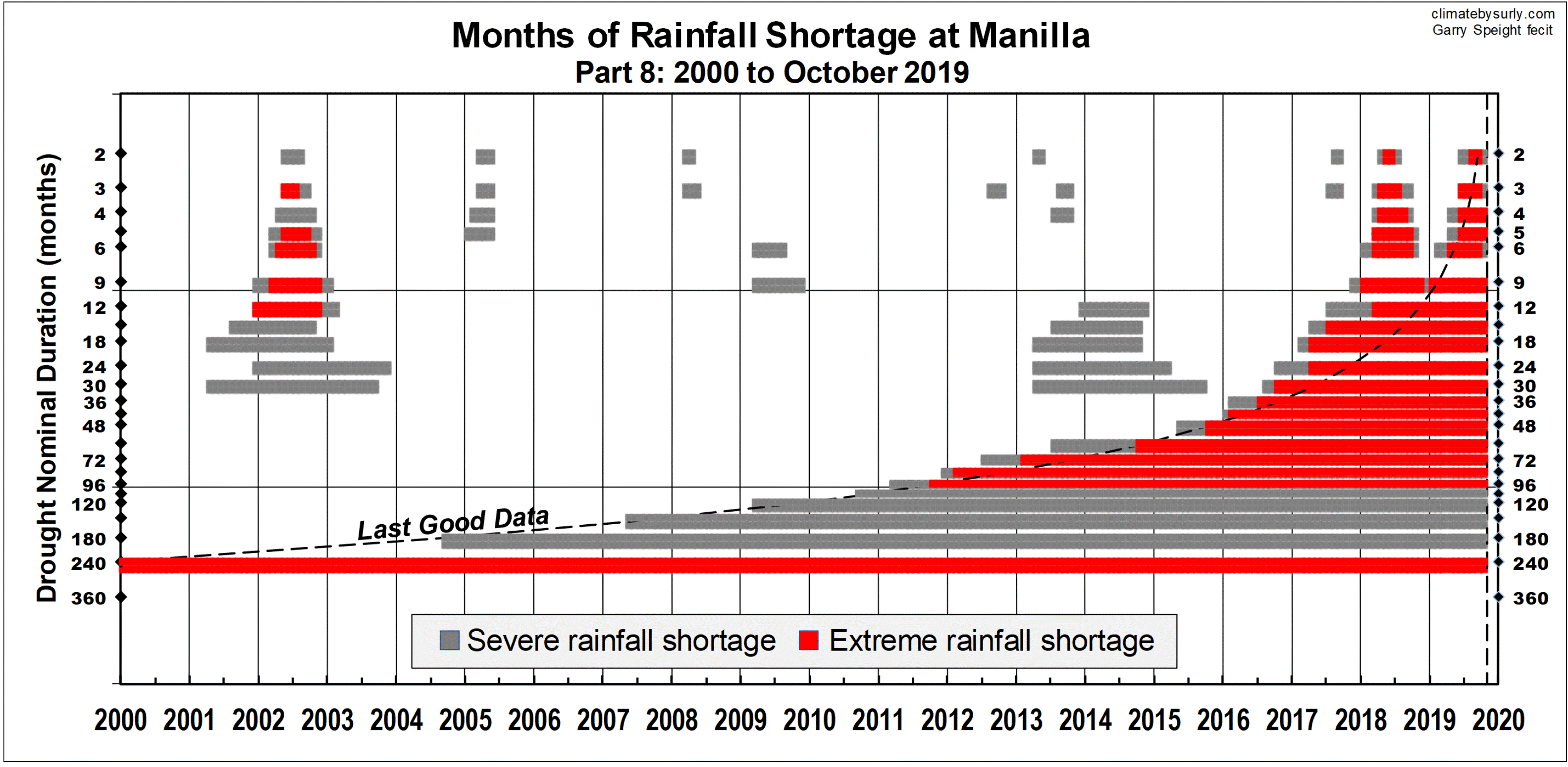 Published November 15, 2019 at 3166 × 1548 in 21stC Rain Shortage Oct ’19 Next » Record of severe and extreme rainfall shortages at Manilla NSW from onset to breaking, from January 2000 to October 2019. All durations from 2 months to 360 months.
