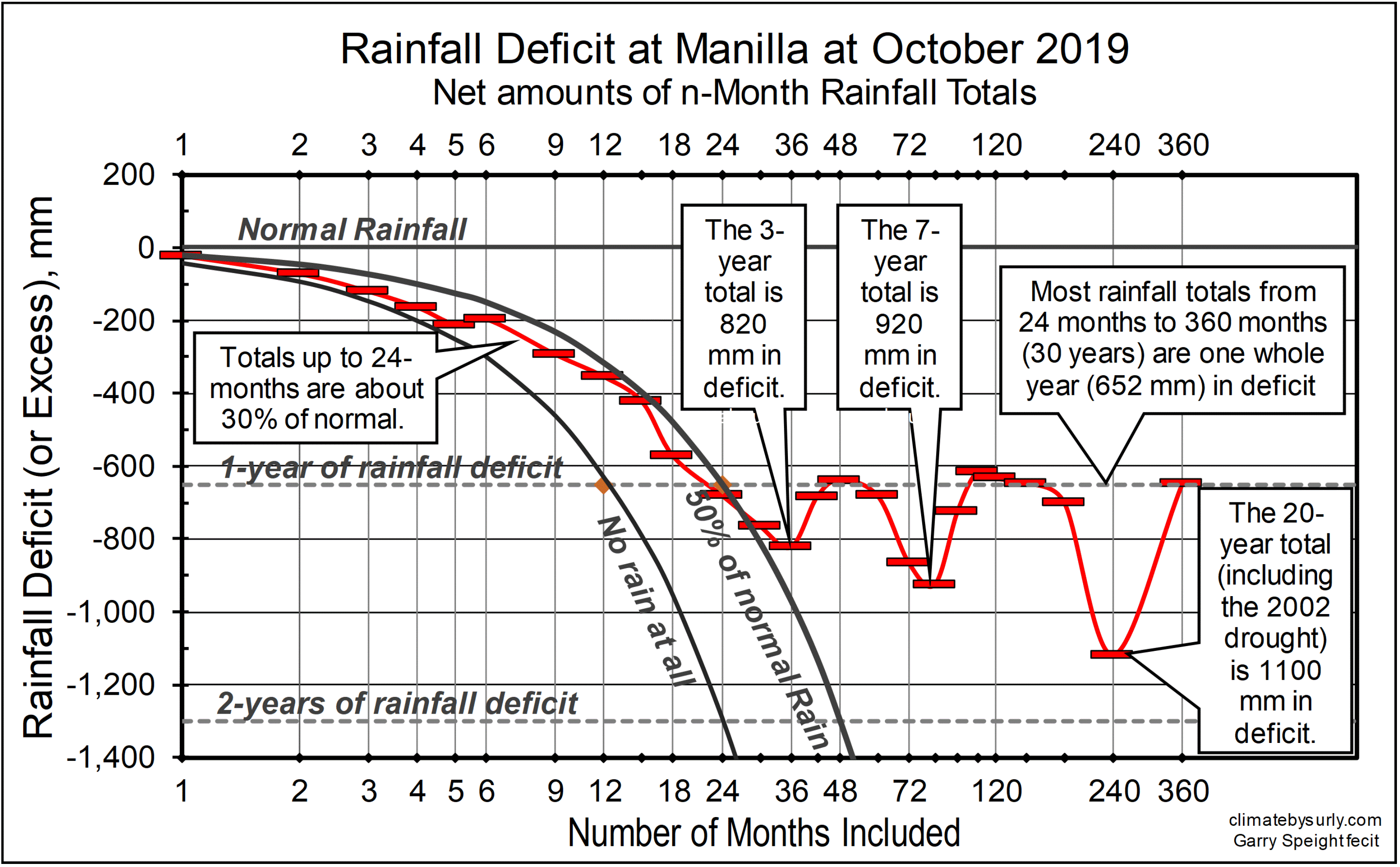 Published November 22, 2019 at 3193 × 1978 in How much rainfall is now lost? For durations up to 360-months this graph shows the total deficit of rainfall to Oct 2019 at Manilla NSW