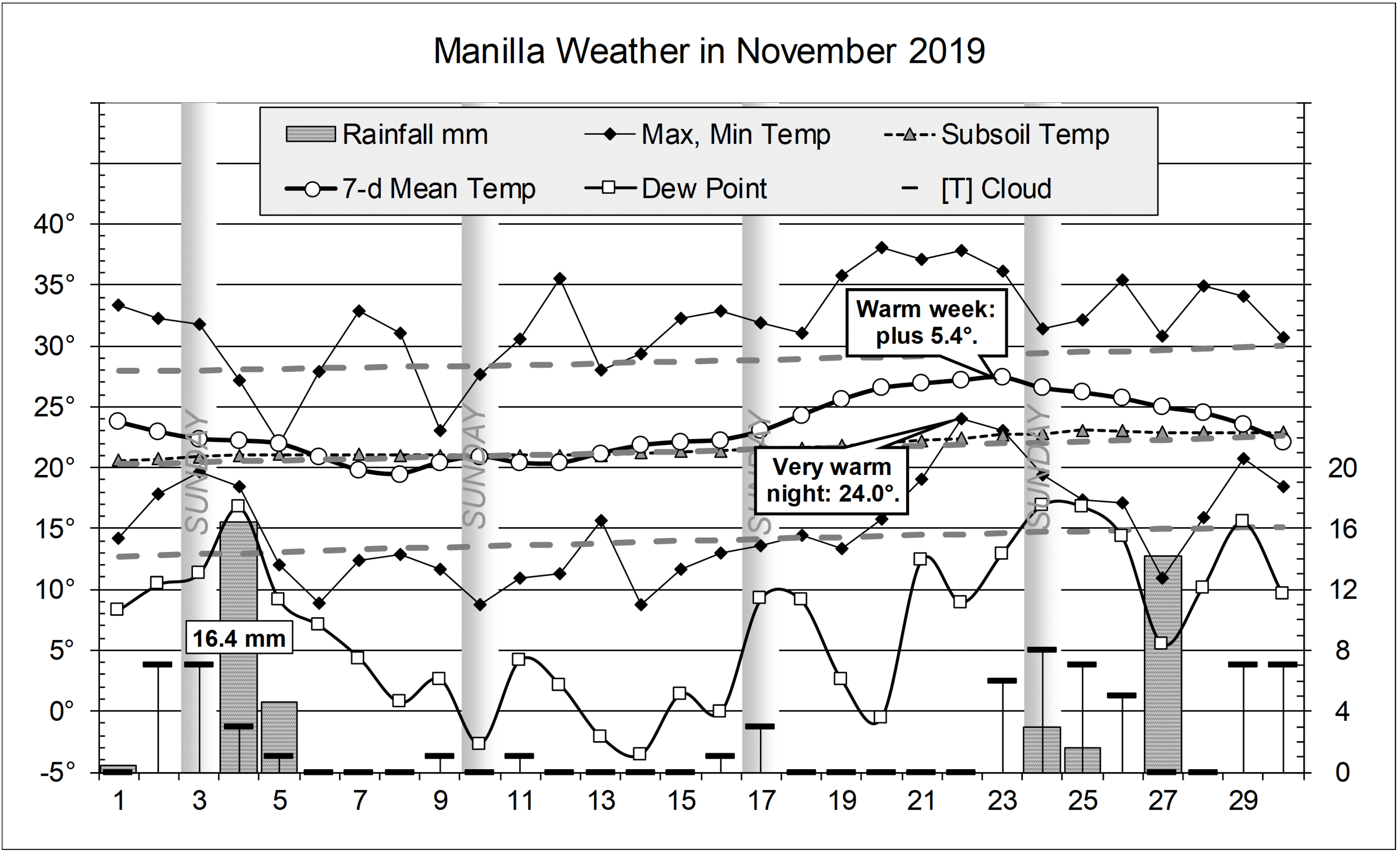 Published December 2, 2019 at 3206 × 1954 in November 2019: one warm week « Previous Next » Graphical log, for November 2019, of daily values of maximum and minimum temperatures, subsoil (750 mm) temperature and early morning dew point (all in degrees Celsius), rainfall (mm) and cloud amount (octas). Weekly mean temperature also shown.