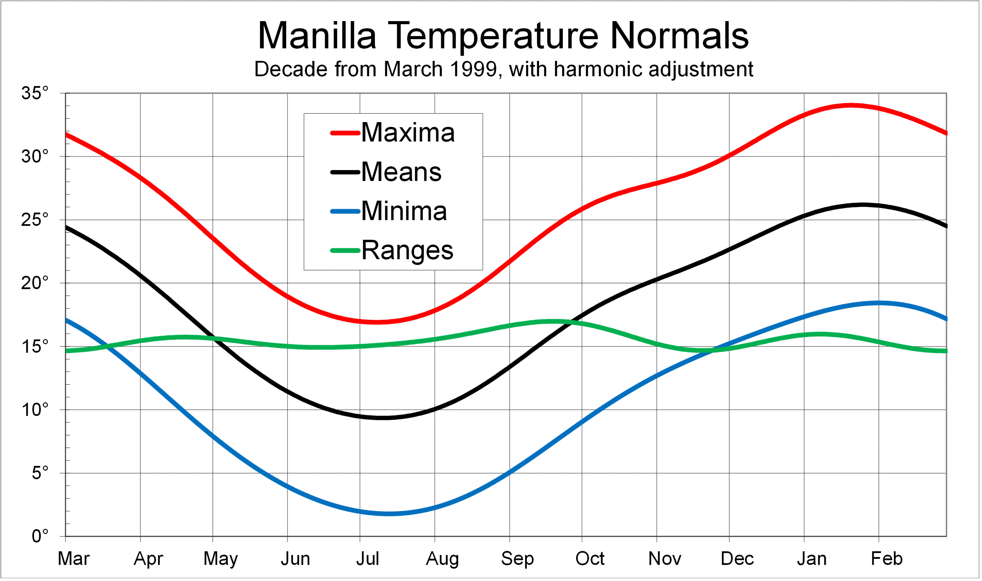 Published January 28, 2020 at 3212 × 1899 in 2019 Climate by months « Previous Next » Manilla temperature normals based on the decade fro March 1999.