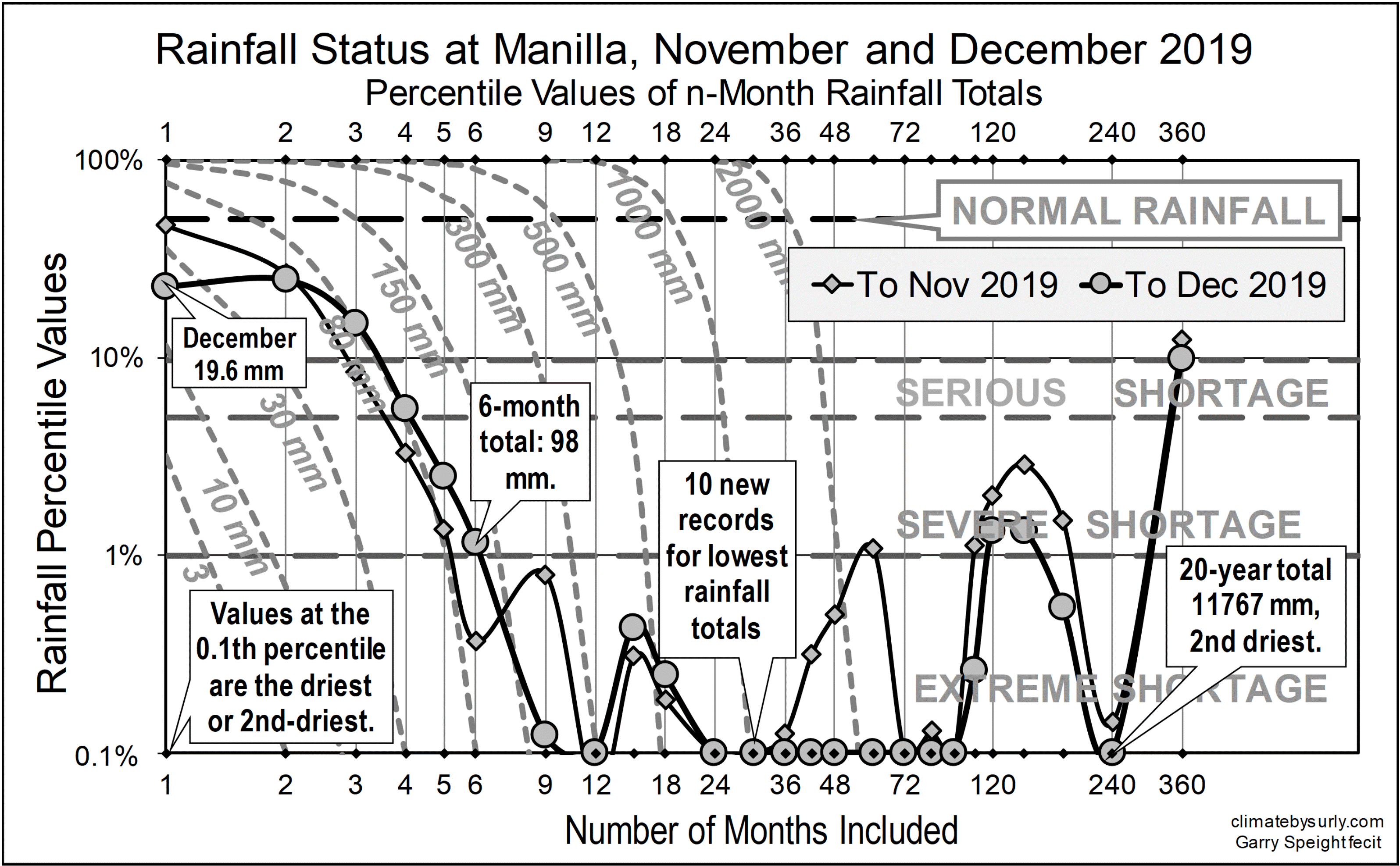 Published February 16, 2020 at 3192 × 1975 in December 2019: 10 new drought records Graph showing shortages of rainfall at Manilla NSW at November and December 2019. Percentile values of periods of one month up to 360 months are shown. Percentiles are classed as extreme, severe, or serious.