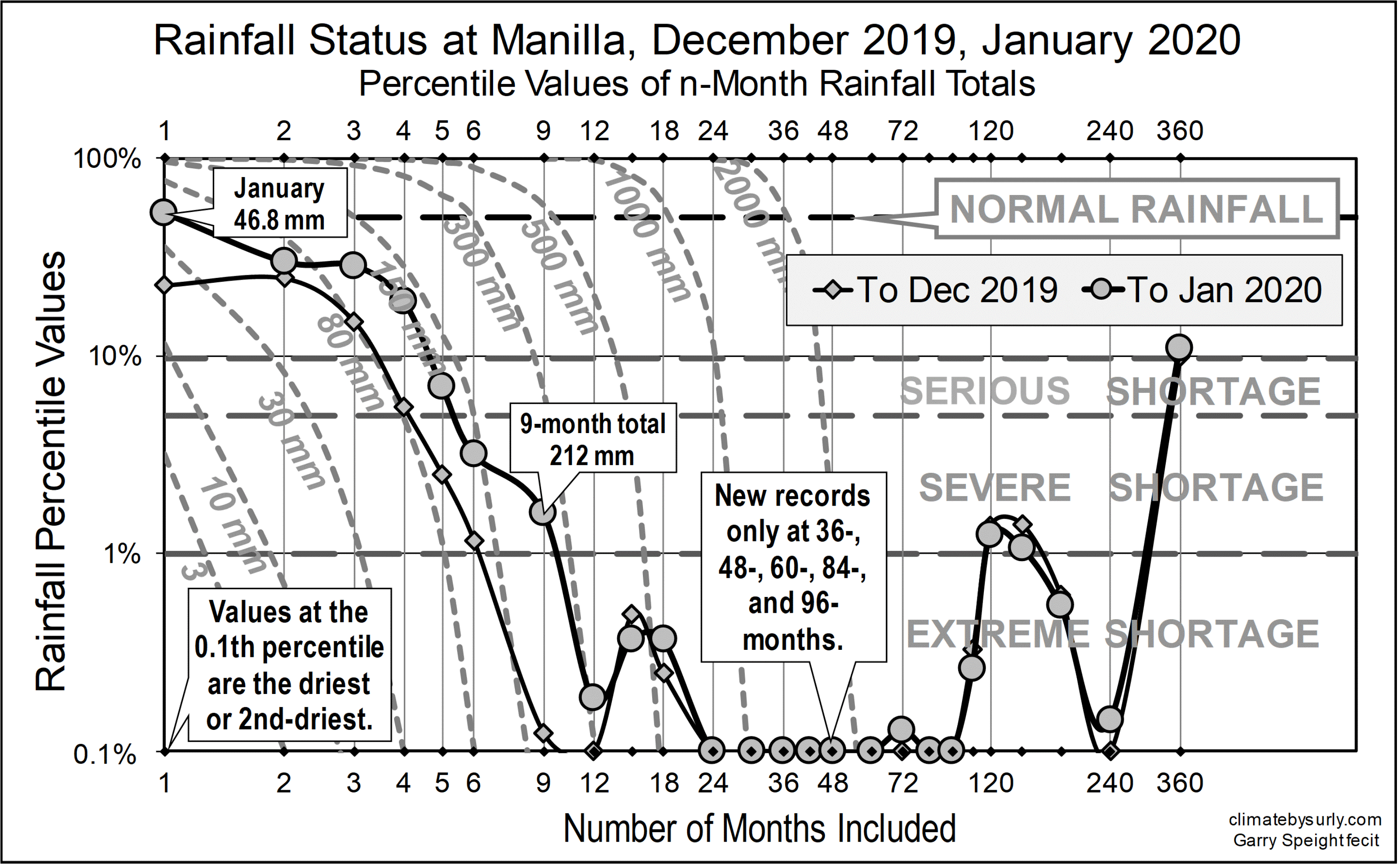 Published February 16, 2020 at 3203 × 1977 in January 2020: still 5 drought records Graph showing shortages of rainfall at Manilla NSW at December 2019 and January 2020. Percentile values of periods of one month up to 360 months are shown. Percentiles are classed as extreme, severe, or serious.