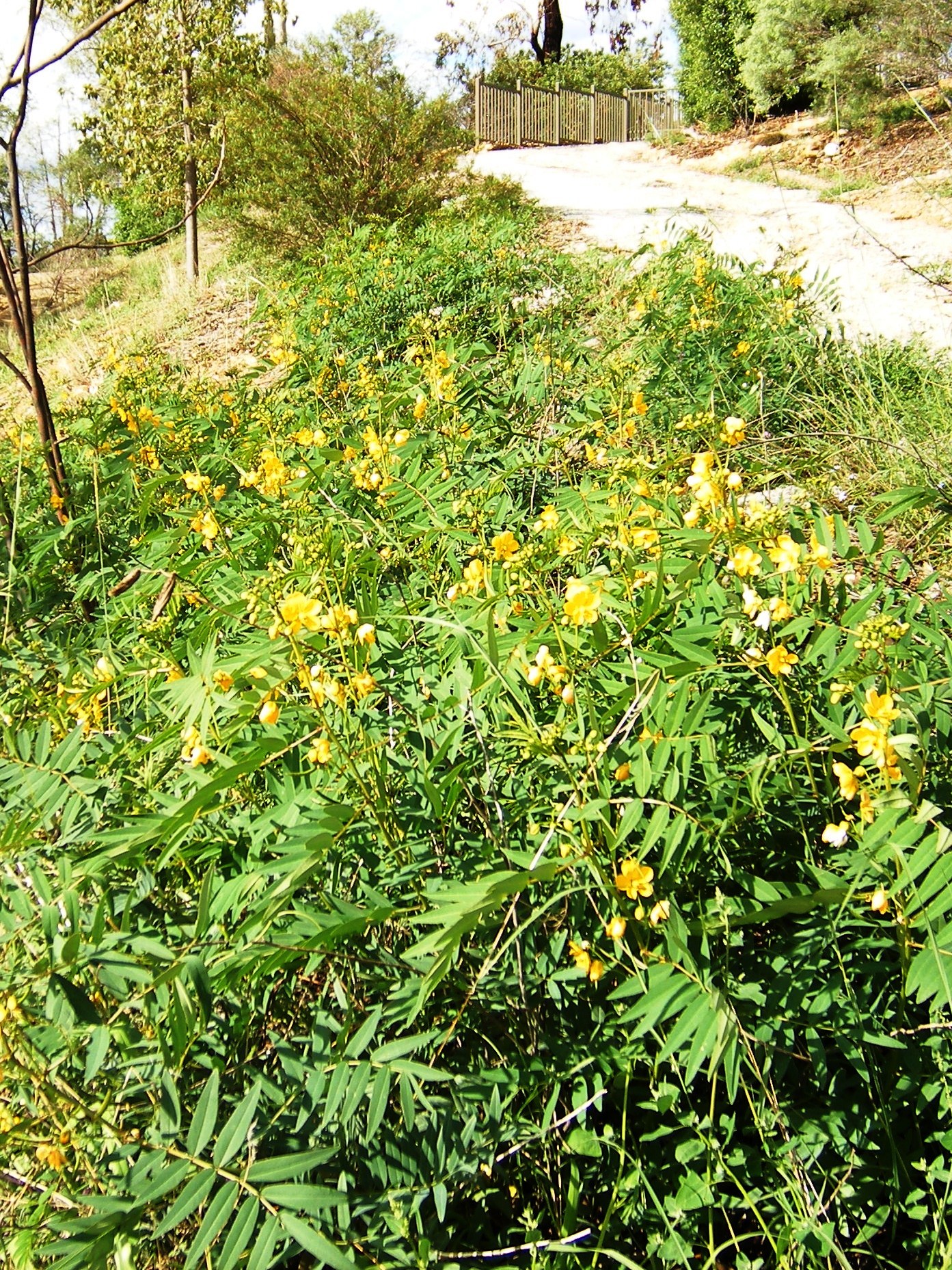 A flush of blooming Pepper-leaf Senna (Senna barclayana) in late February on a bank that had been bare a month earlier. These are self-sown descendants of about 20 plants bought 20 years ago. Pepper-leaf Senna, host to the white migrant butterfly Catopsilia pyranthe, is common in pastures at Manilla.