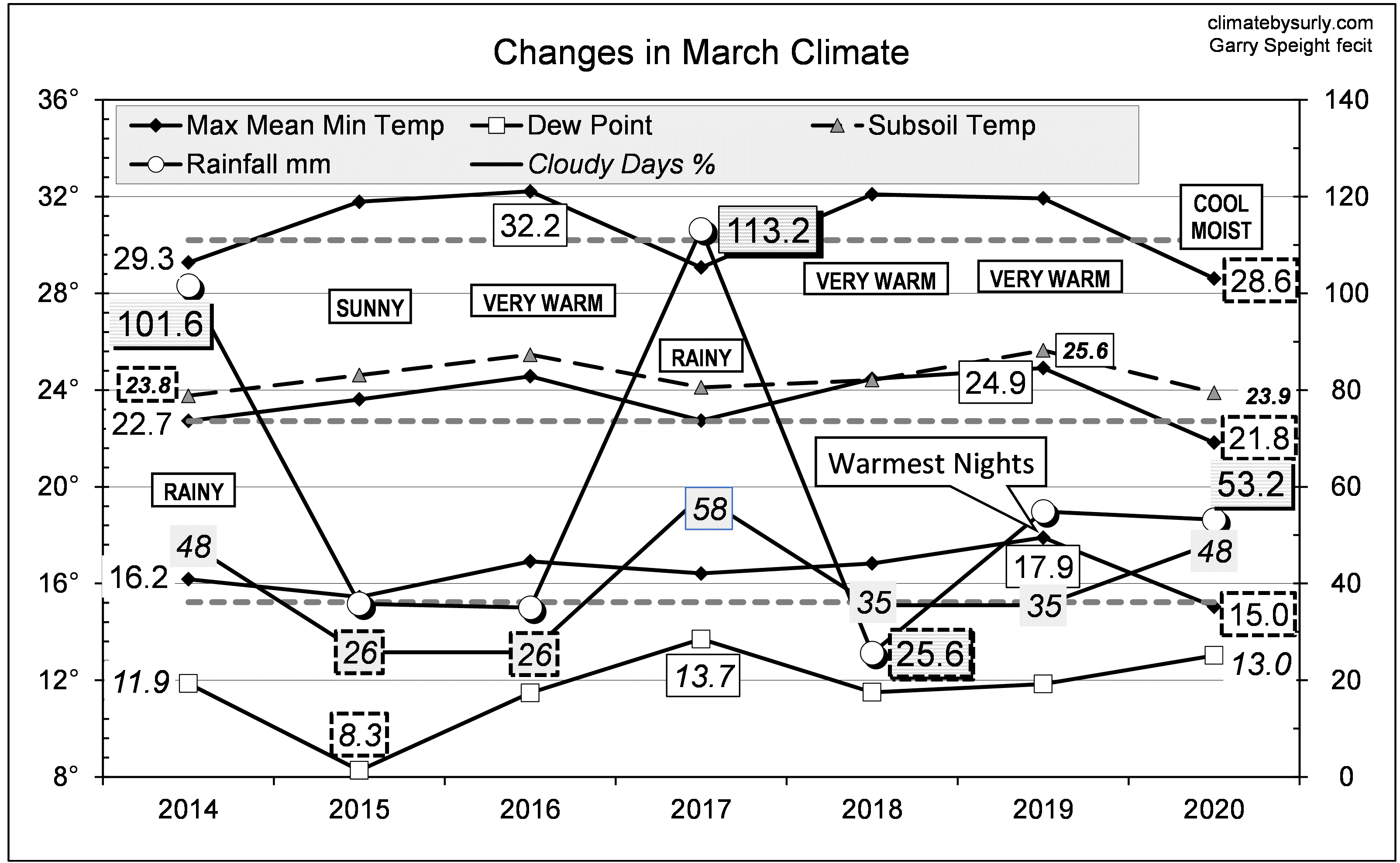 Published June 21, 2020 at 3207 × 1977 in March 2020: cool, moist « Previous Graphical log of the last seven March months at Manilla, NSW, showing mean values of maximum, minimum and mean temperature, soil temperature, early morning dew point and cloudy days percent, and total monthly rainfall in millimetres.
