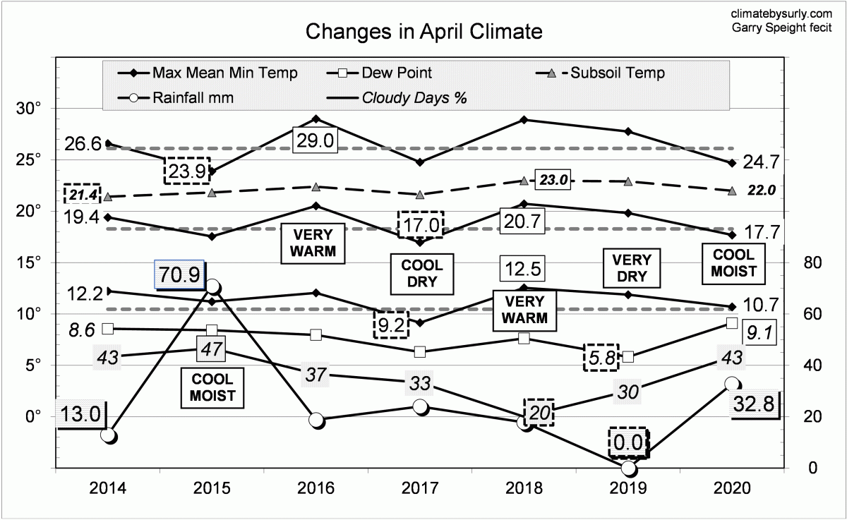 Published June 24, 2020 at 3217 × 1976 in April 2020: cool, moist « Previous Graphical log of the last seven March months at Manilla, NSW, showing mean values of maximum, minimum and mean temperature, soil temperature, early morning dew point and cloudy days percent, and total monthly rainfall in millimetres.