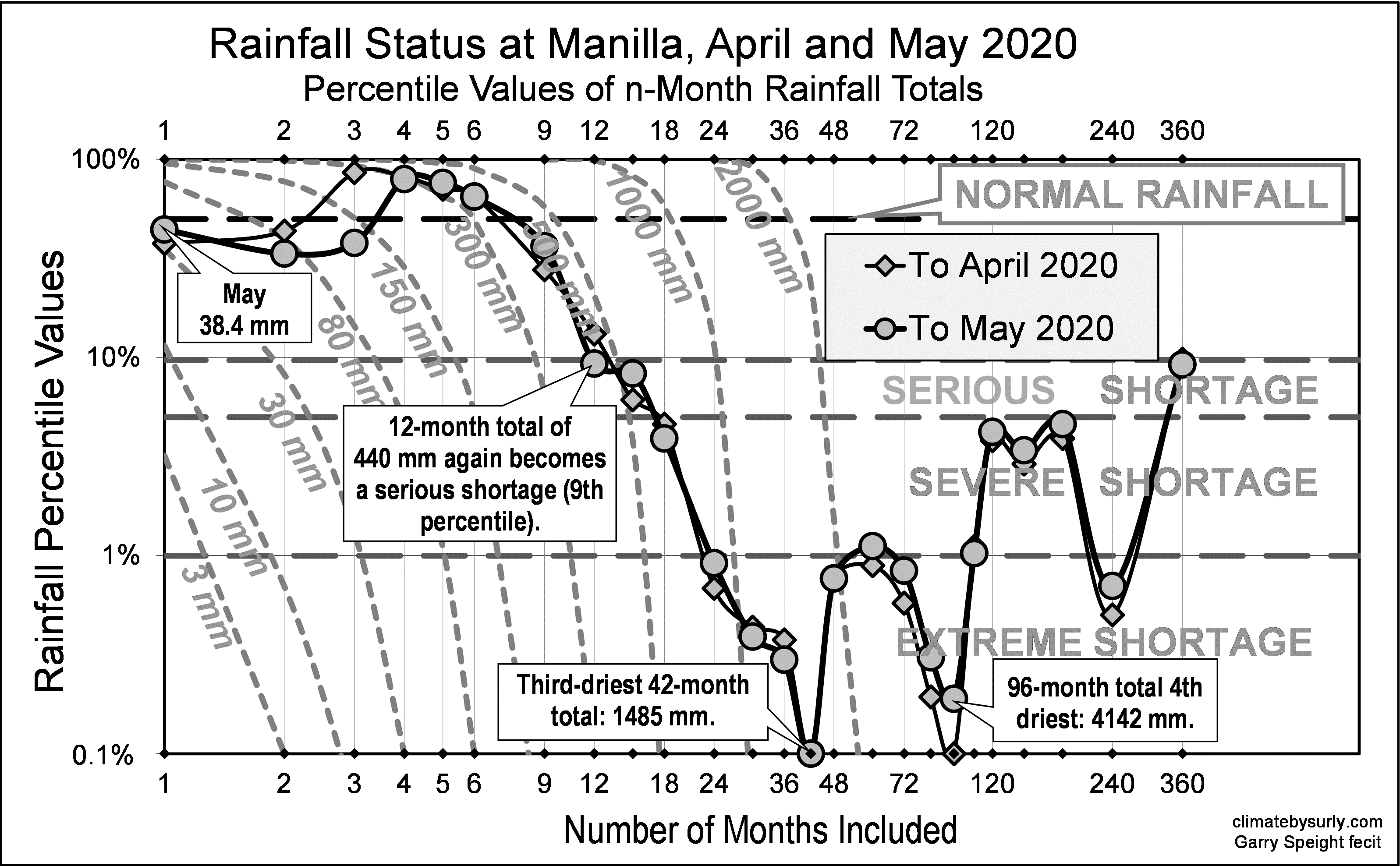 Published June 28, 2020 at 3195 × 1977 in May 2020: as in March, no new drought records Graph showing shortages of rainfall at Manilla NSW at April and May 2020. Percentile values of periods of one month up to 360 months are shown. Percentiles are classed as extreme, severe, or serious.