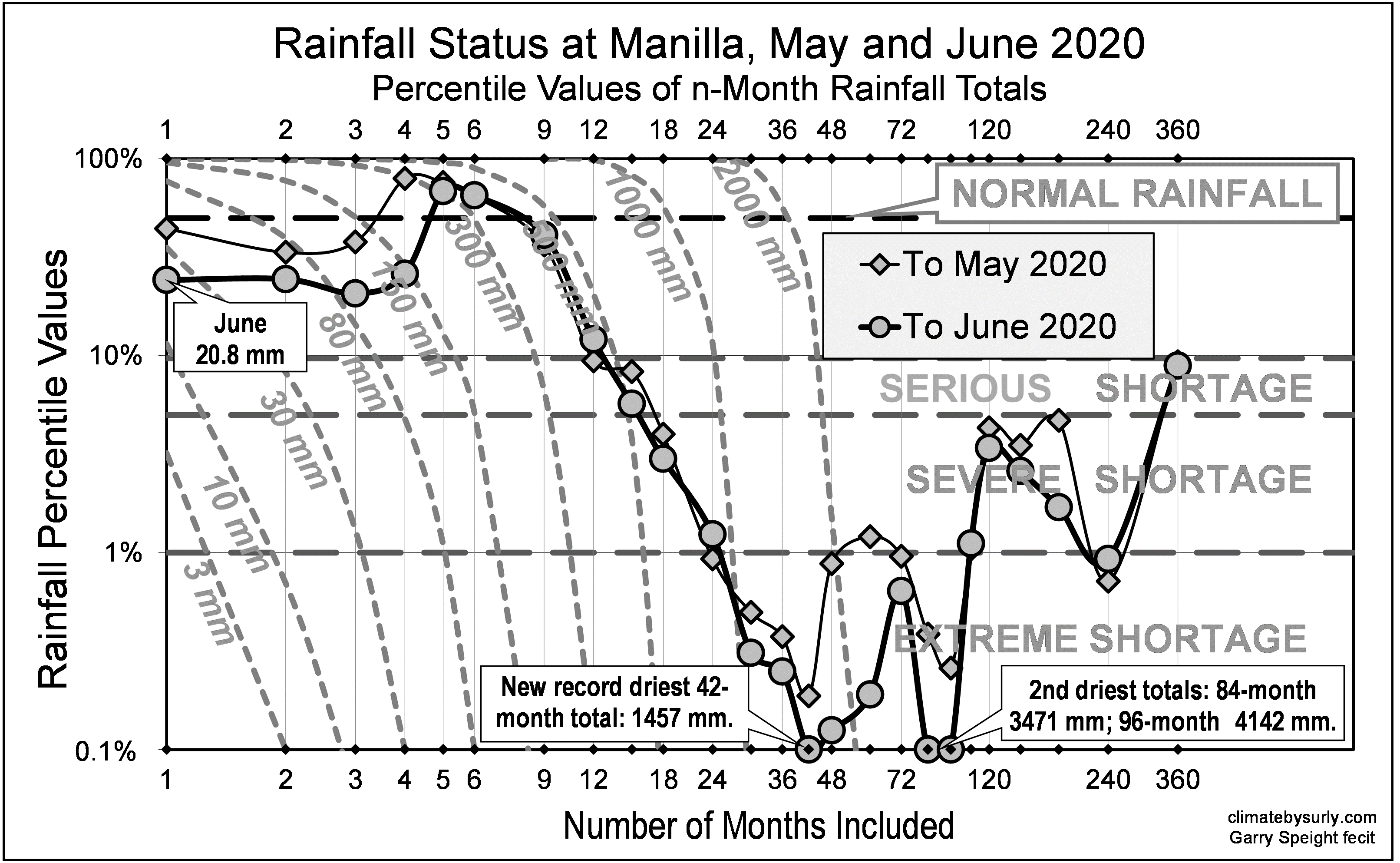 Published July 2, 2020 at 3224 × 1987 in June 2020: return to a 42-month drought record Graph showing shortages of rainfall at Manilla NSW at May and June 2020. Percentile values of periods of one month up to 360 months are shown. Percentiles are classed as extreme, severe, or serious.