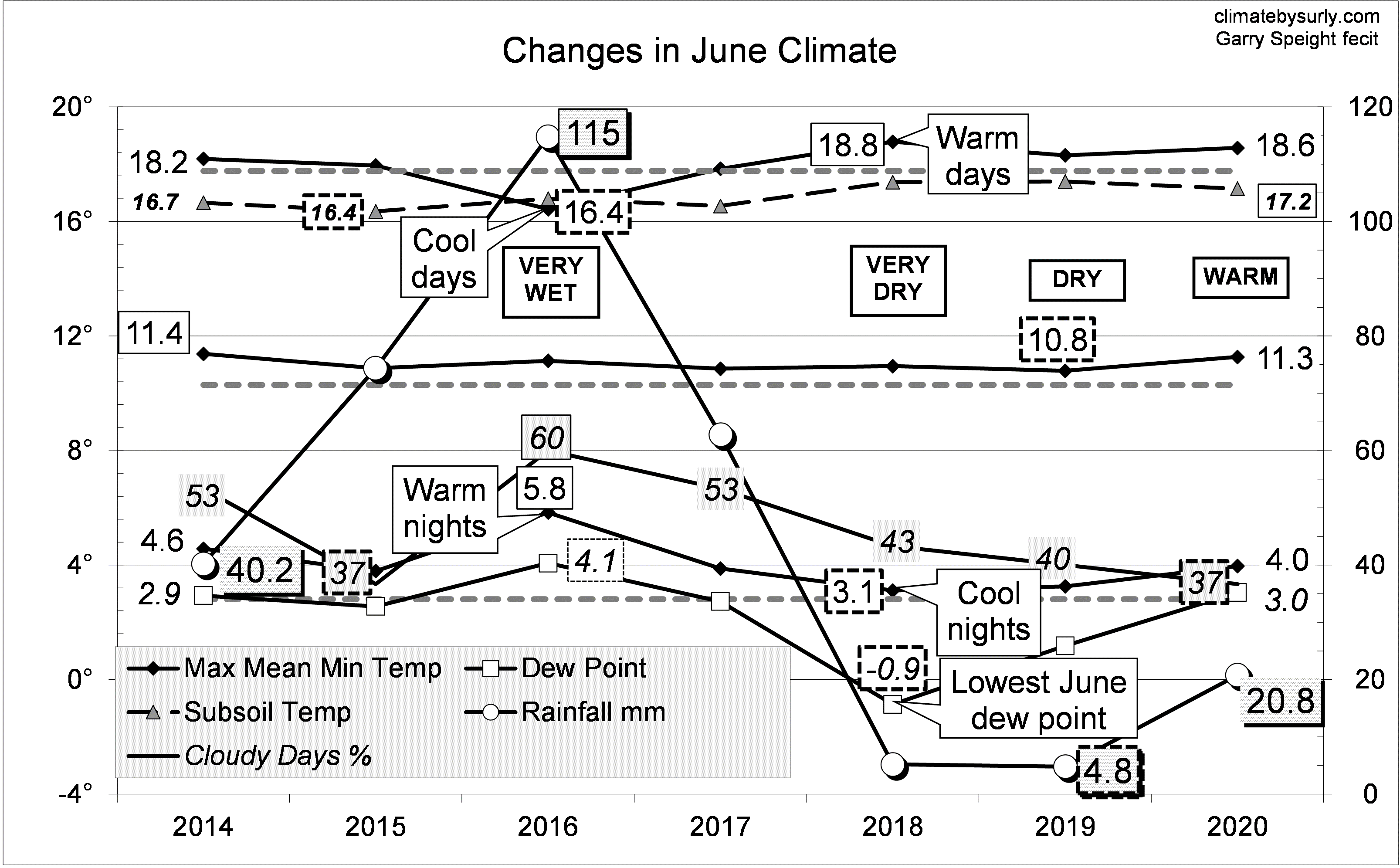 Published July 18, 2020 at 3213 × 1992 in June 2020: warm and dry again « Previous Graphical log of the last seven June months at Manilla, NSW, showing mean values of maximum, minimum and mean temperature, soil temperature, early morning dew point and cloudy days percent, and total monthly rainfall in millimetres.