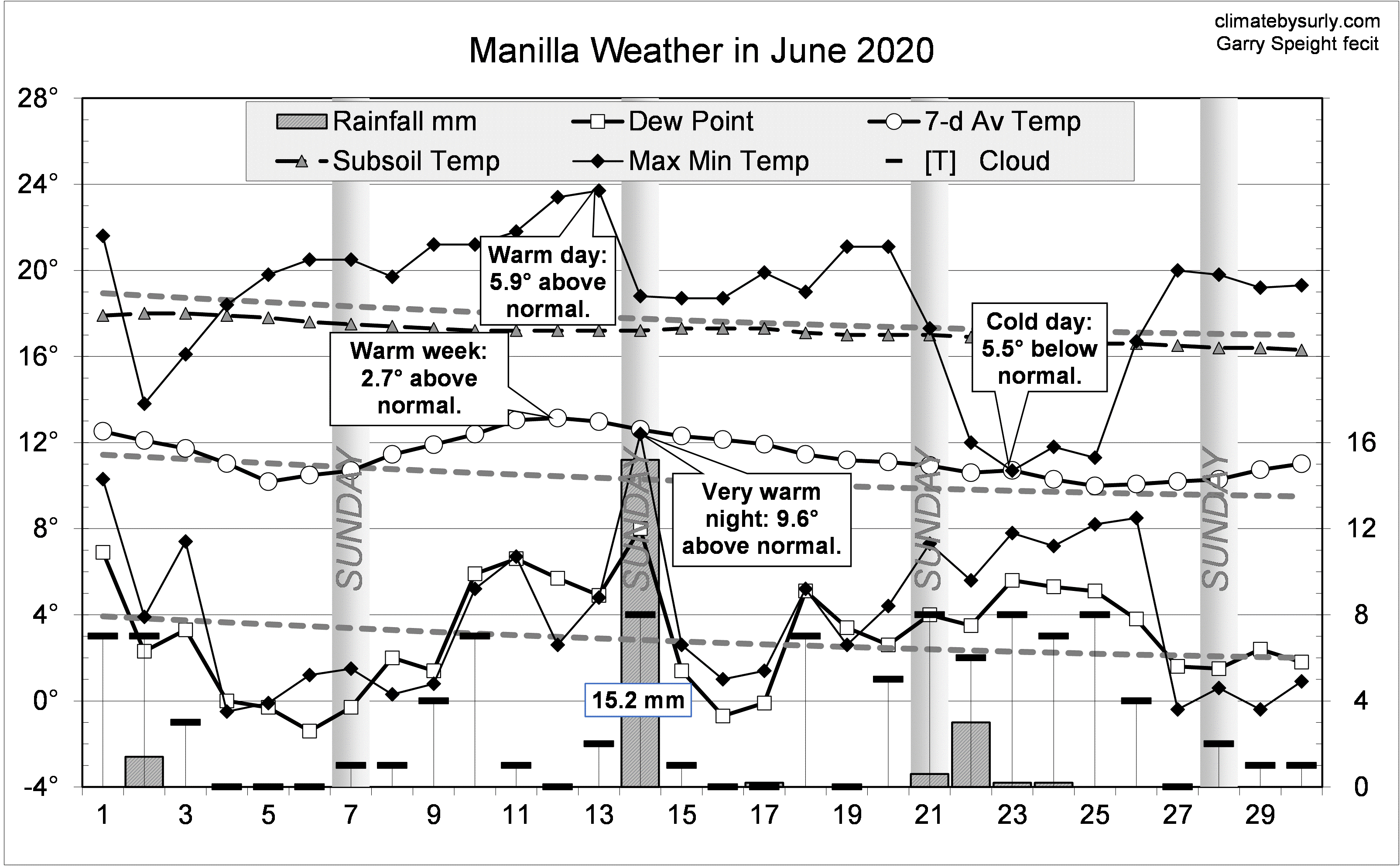 Published July 18, 2020 at 3209 × 1988 in June 2020: warm and dry again Next » Graphical log, for June 2020, of daily values of maximum and minimum temperatures, subsoil (750 mm) temperature and early morning dew point (all in degrees Celsius), rainfall (mm) and cloud amount (octas). Weekly mean temperature also shown.