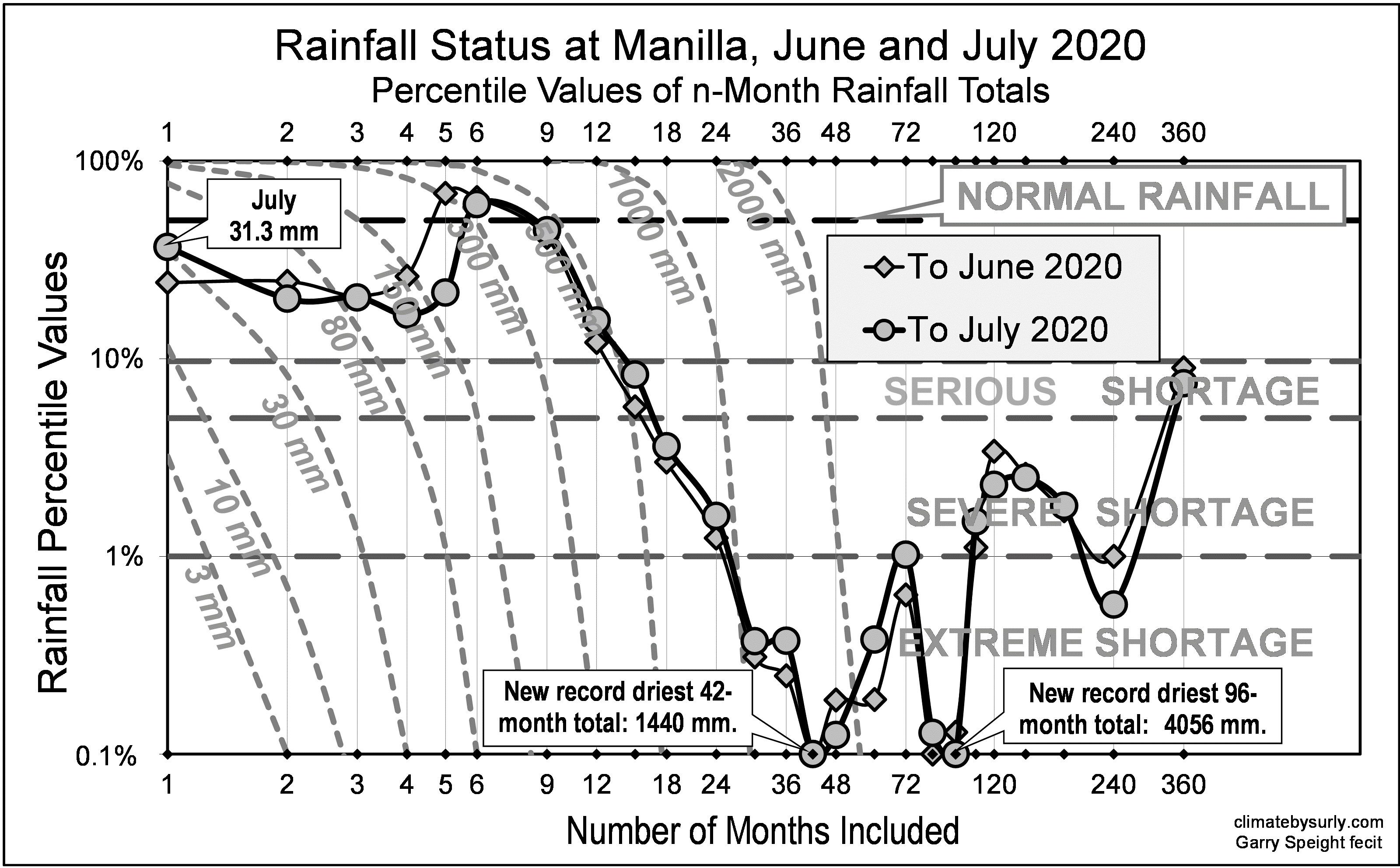Published August 9, 2020 at 3200 × 1985 in July 2020: extreme drought lingers Graph showing shortages of rainfall at Manilla NSW at June and July 2020. Percentile values of periods of one month up to 360 months are shown. Percentiles are classed as extreme, severe, or serious.
