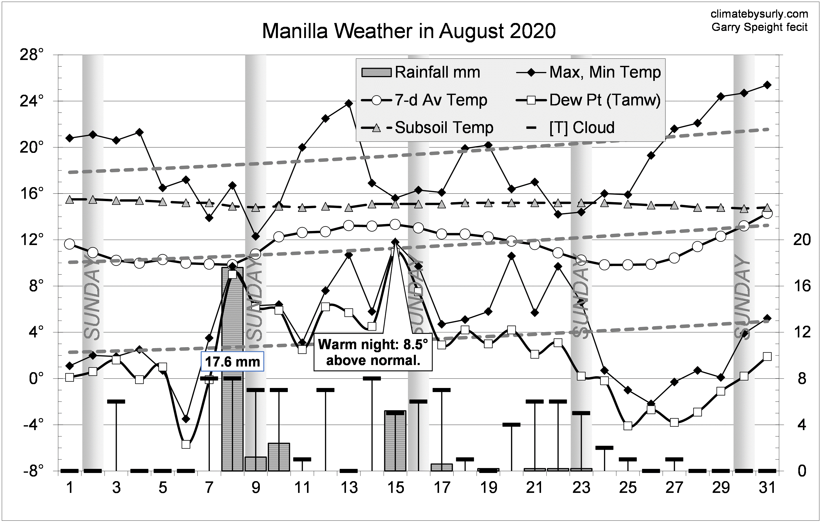 20Augweather Published September 5, 2020 at 3220 × 2049 in August 2020: warm nights and cool days Next » Graphical log, for August 2020, of daily values of maximum and minimum temperatures, subsoil (750 mm) temperature and early morning dew point (all in degrees Celsius), rainfall (mm) and cloud amount (octas). Weekly mean temperature also shown.
