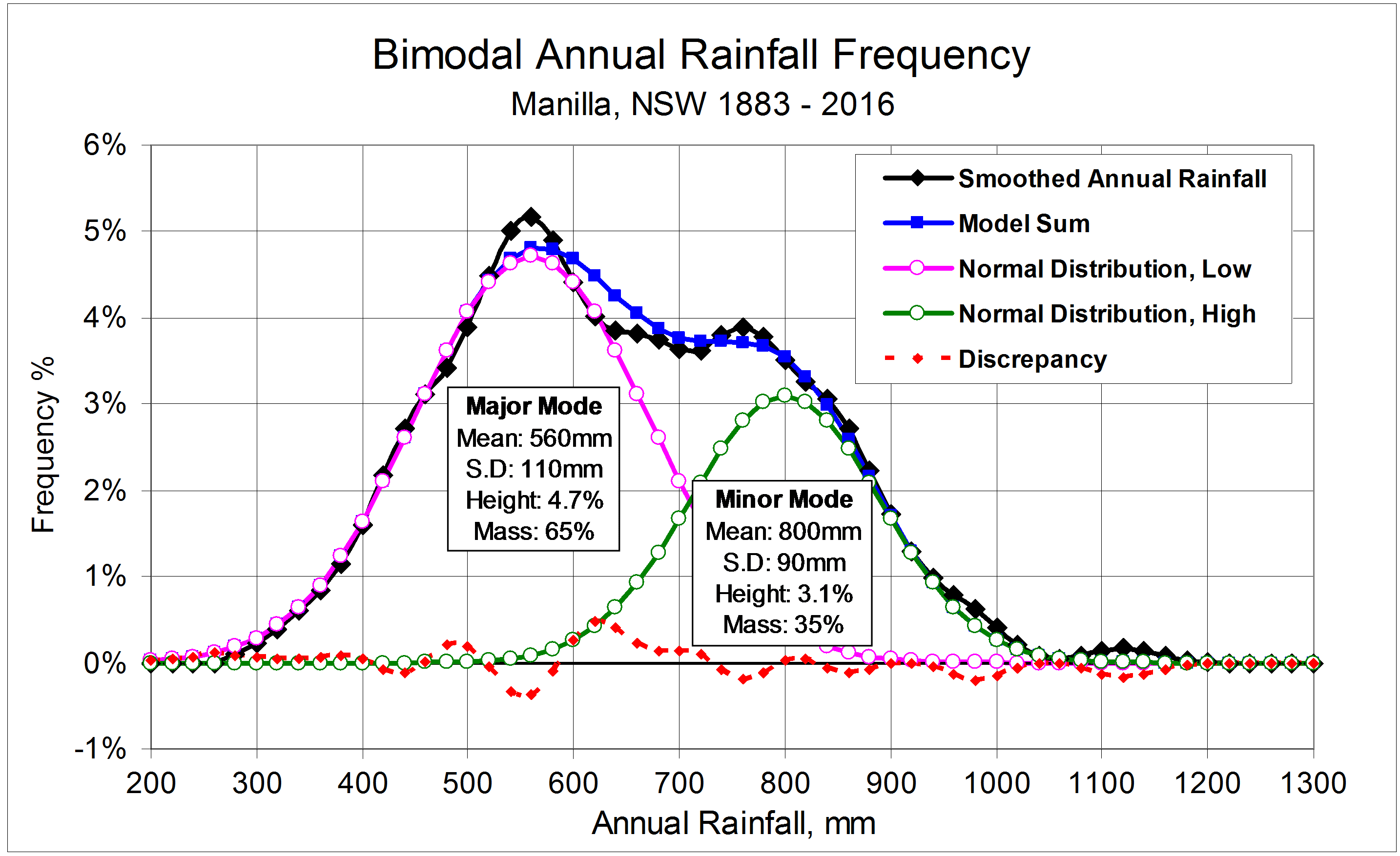 Published July 22, 2017 at 2868 × 1755 A smoothed curve of the annual rainfall frequency at Manilla NSW from 1883, with best fit bimodal normal curves. Discrepancies are shown.